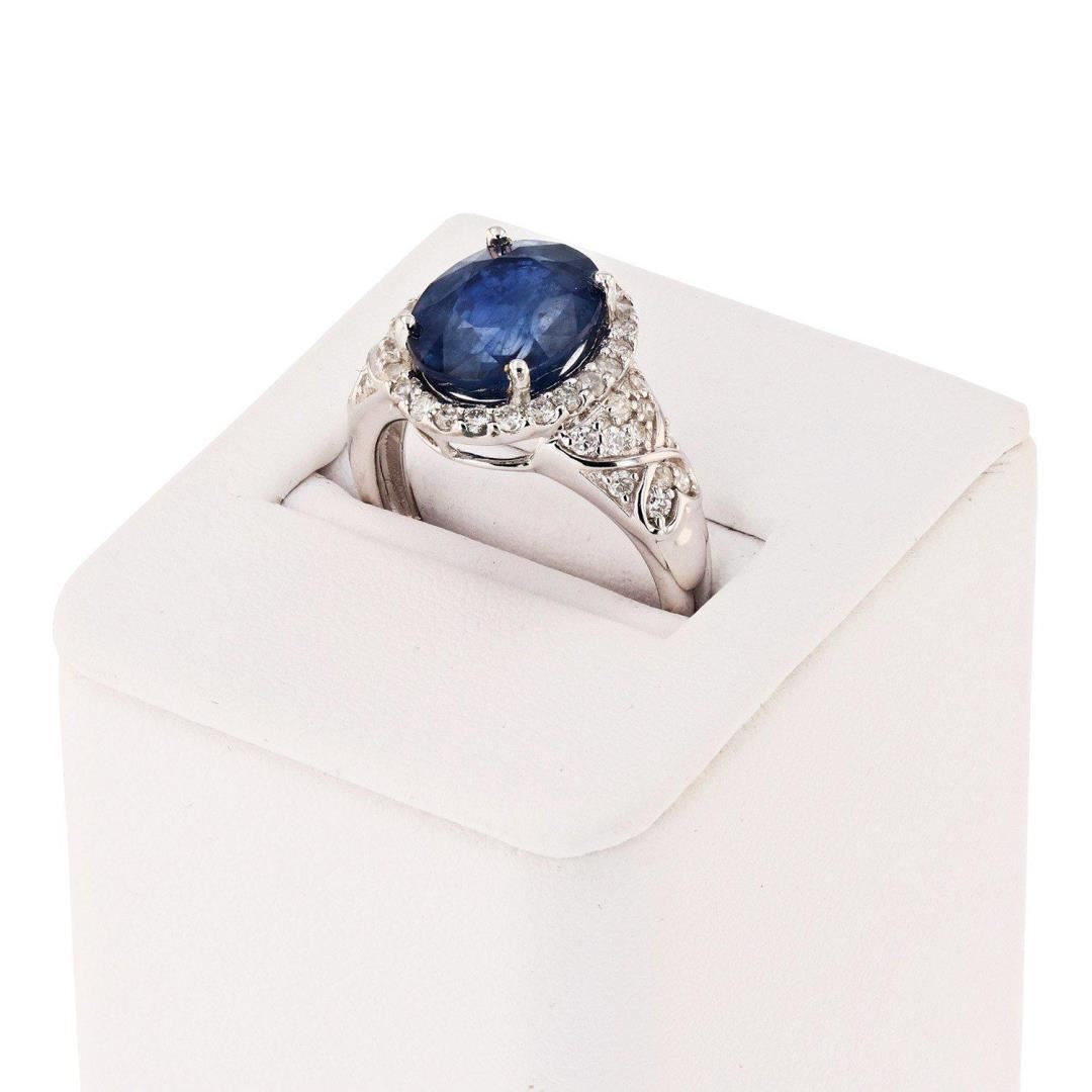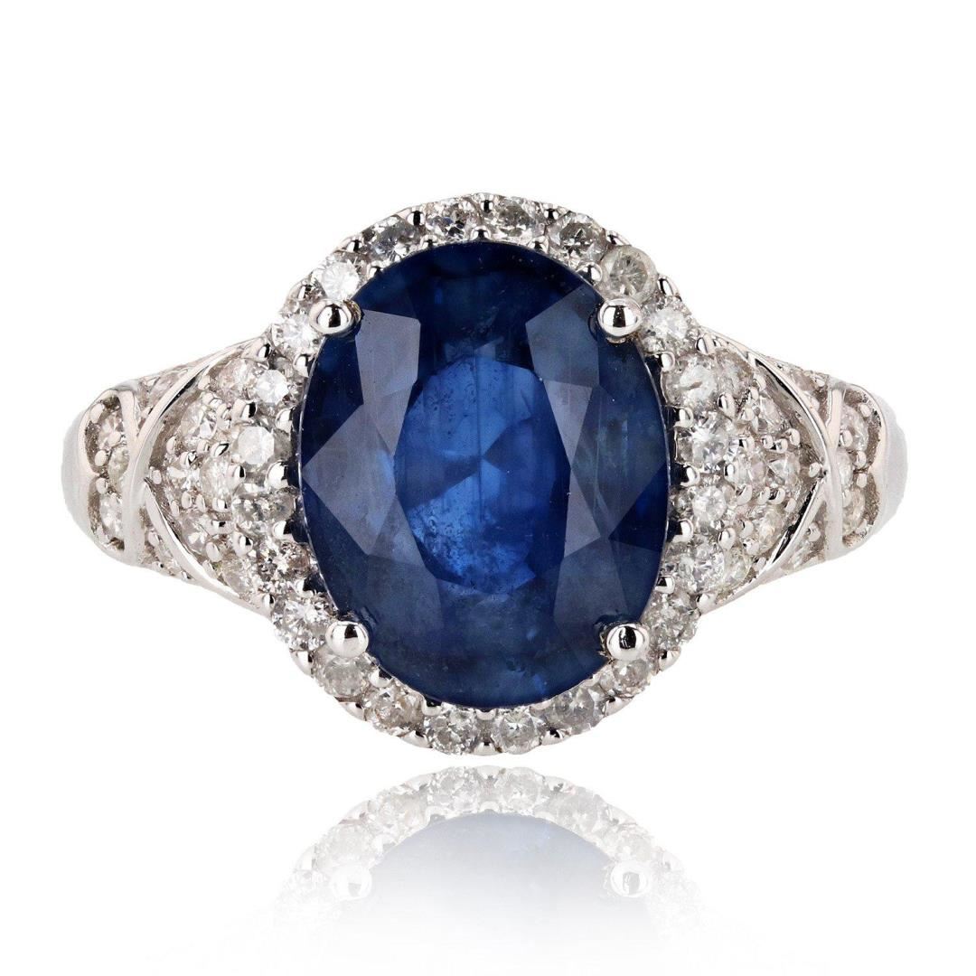 One electronically tested 14KT white gold ladies cast sapphire and diamond ring with a bright polish finish. Condition is new, good workmanship. The featured sapphire is set within a diamond bezel supported by elaborate diamond set shoulders, completed by a two millimeter wide band. Trademark is Orianne. Identified with markings of "14K". Containing: One prong set oval mixed cut natural blue sapphire approximate weight of 4.79ct., clarity is moderately included, type II, medium dark, moderately strong, blue color, (GIA B 6/4), cut is good. Transmitting light with a minimum of distortion, transparent. Naturally occurring internal and external characteristics are present. Indications of laboratory high temperature diffusion treatment. Graded in the setting. Forty-six prong set round brilliant cut diamonds approximate total weight of 46 Stones = 0.57ct. Graded in the setting. Clarity I1 to I2 Color G - I Total Weight of Colored Stones 4.79ct. Total Weight of Diamonds 0.57ct. Total Weight of Ring 5.08 gm