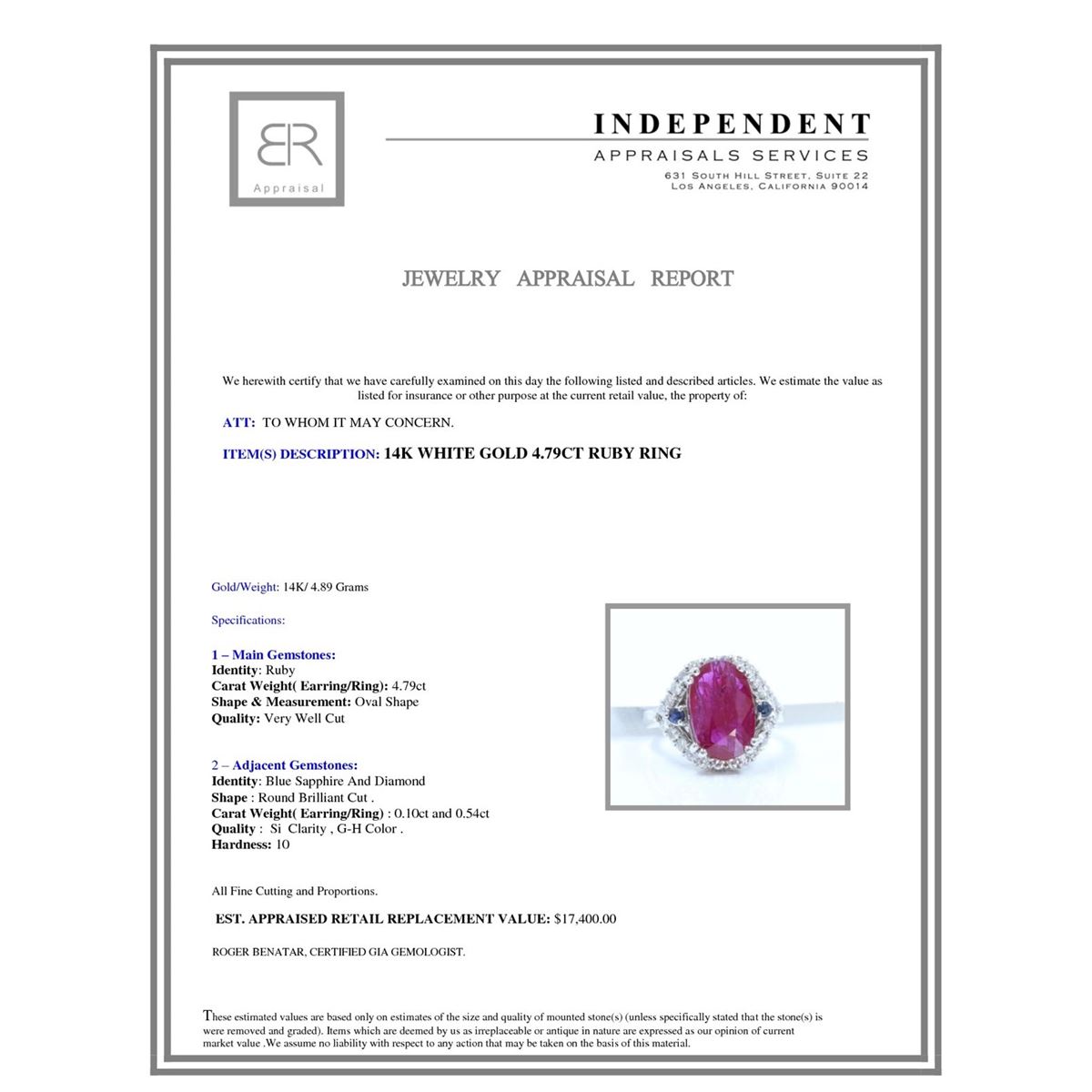 14K W/G NATURAL RUBY RING: 4.89GRAM /BLUE SAPPHIRE :0.10CT/DIAMOND :0.54CT /RUBY: 4.79CT/#GVR1344/NO LEAD OR GLASS FILLING