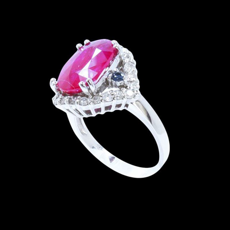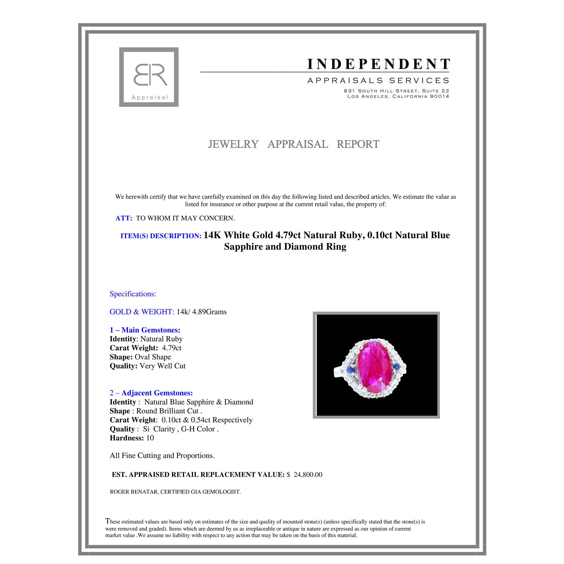 14K W/G NATURAL RUBY RING: 4.89GRAM /BLUE SAPPHIRE :0.10CT/DIAMOND :0.54CT /RUBY: 4.79CT/#GVR1344/NO LEAD OR GLASS FILLING