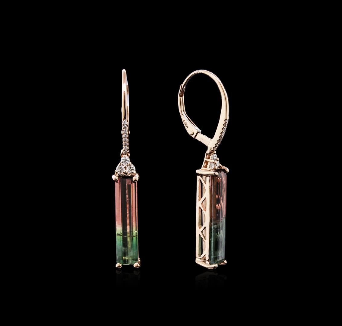 One pair of earrings featuring: 14KT rose gold weighing 2.47 grams containing two bi-color tourmaline with a total weight of 4.79ct and diamonds with a total weight of 0.16ct.
