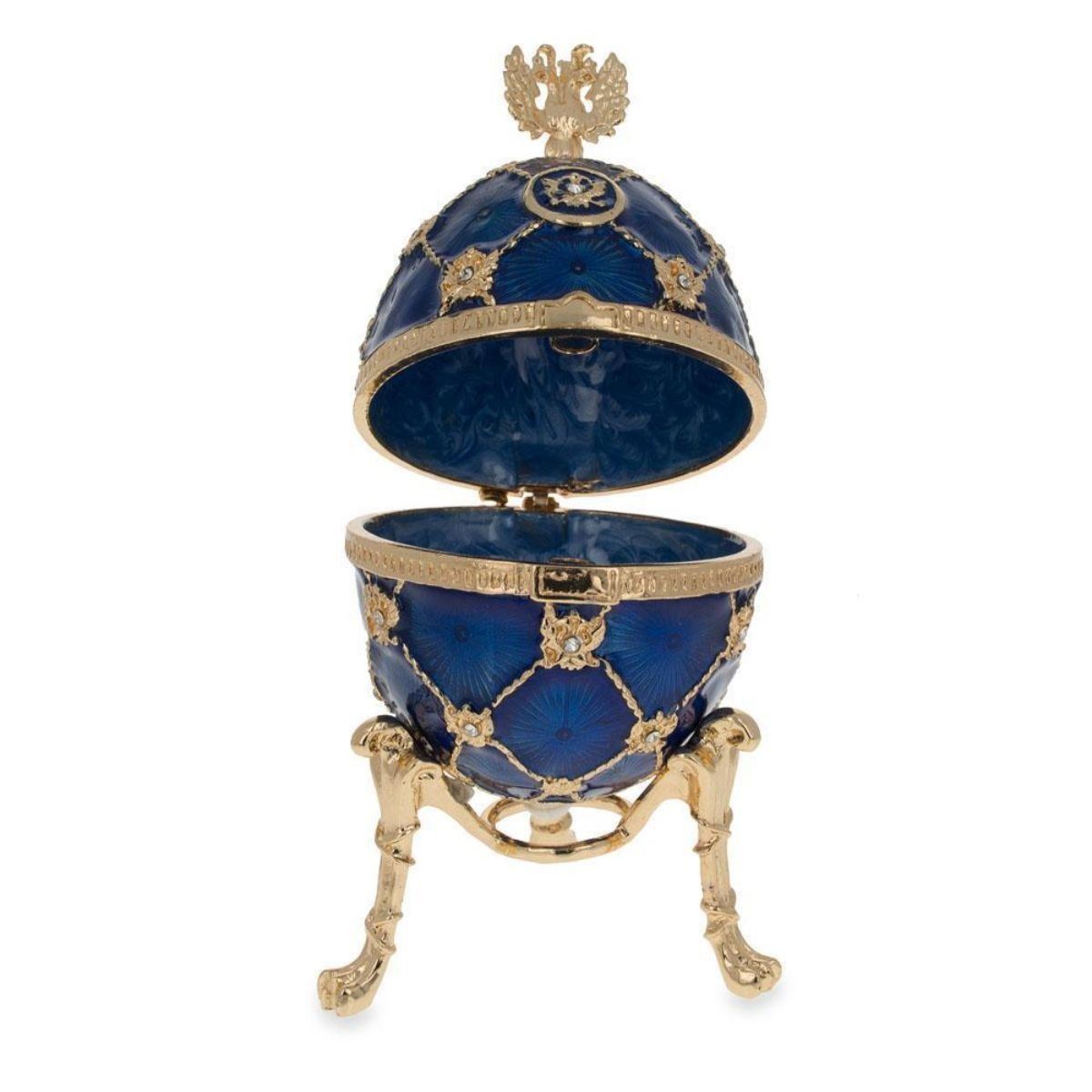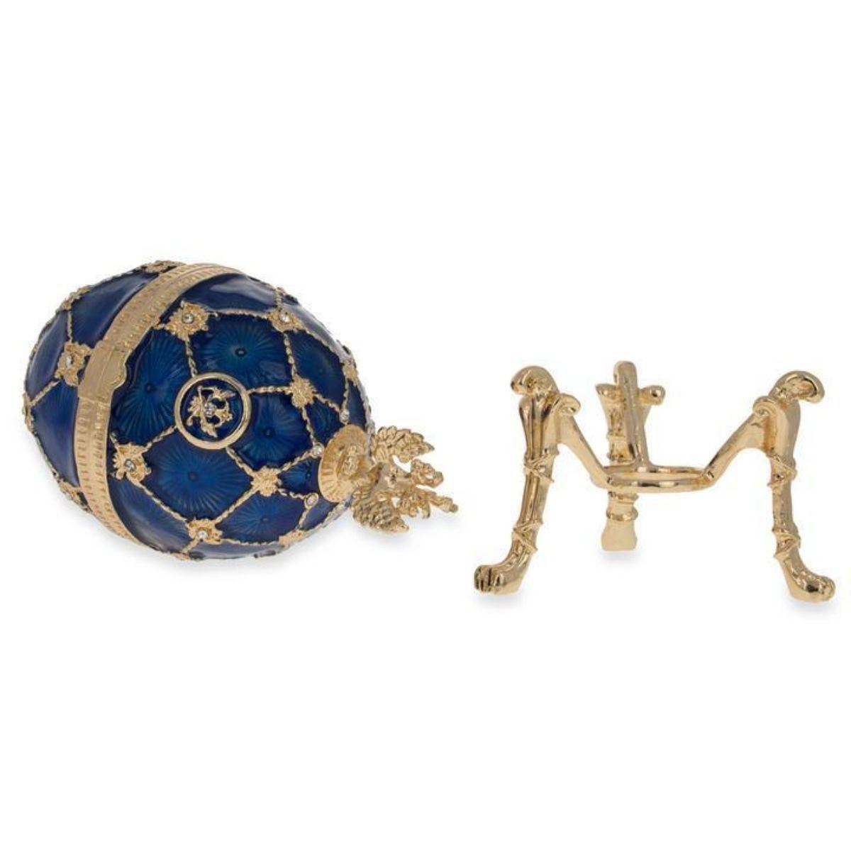 4.8 Inches Tall (with stand) x 2.2 Inches Diameter 12 cm Tall x 5.5 cm Diameter Enamel Gold Plated Pewter Hand Painted Russian Style Gift Boxed This sparkling egg is adorned with high-polished enamel with golden trim. It opens on a hinge and has a magnetic closure to keep the box securely shut. The piece also comes in a beautiful gift box.
