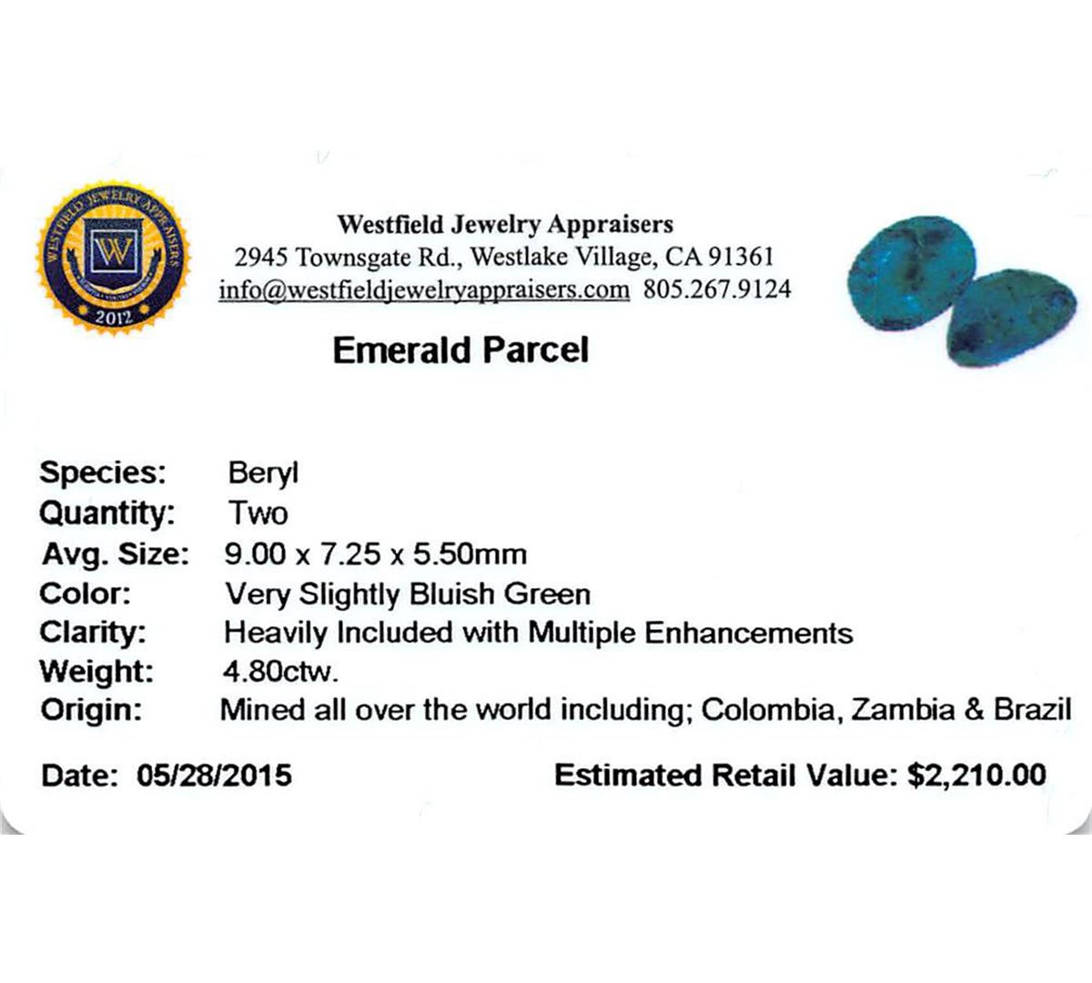 Two oval mixed cut natural emeralds, measuring 9.00 x 7.25 x 5.50mm, exact total weight 4.80ct., clarity is heavily included, type III, medium dark, very slightly grayish, very slightly bluish green color, (GIA vslbG 6/3), cut is good. Transmitting light somewhat diffusely, translucent, Naturally occurring internal & external characteristics are present, Indications of multiple laboratory enhancements, including high temperature heat treatment. Westfield Appraised at $2,210.00.