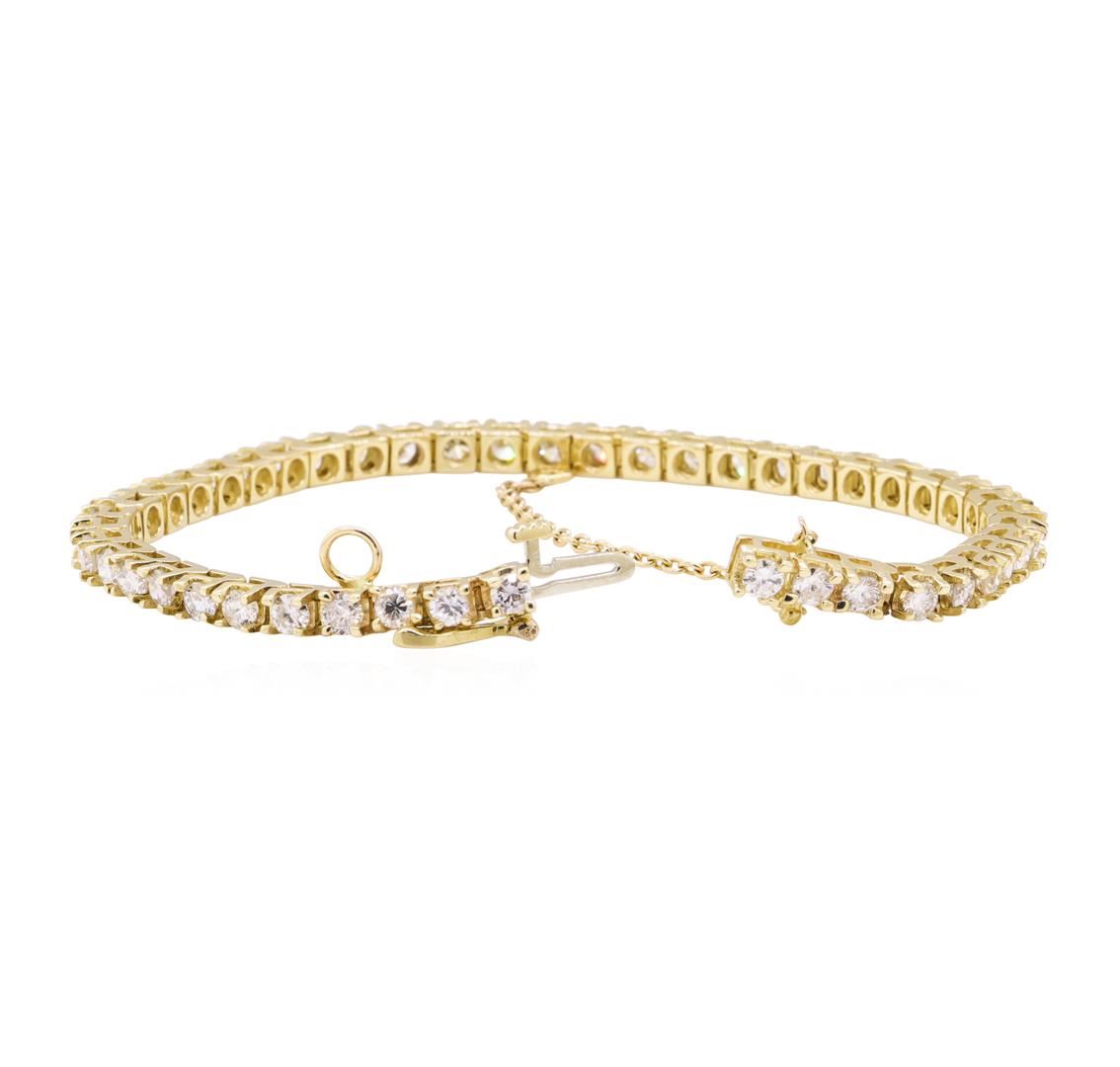 One electronically tested 14KT yellow gold lady's combination cast & assembled fashion tennis bracelet with a tongue clasp with foldover safety with a bright polish finish. The featured lady's bracelet has an attached safety chain and measures approximately six and a half inches in length. Identified with markings of '14K'. Condition is like new, good workmanship. Containing: Forty-Six prong set round brilliant cut diamonds, measuring 3.15 - 3.00 x 1.80mm (depth est.) approximate total weight of 46 Stones = 4.80ct. Graded in the setting. Color H - I Clarity SI-1 to SI-2 Cut Good. Total Weight of Diamonds 4.80ct.. Total Weight of Bracelet 12.30gm GAS Appraised at $11985.00. GAS Appraised at $11,985.00.