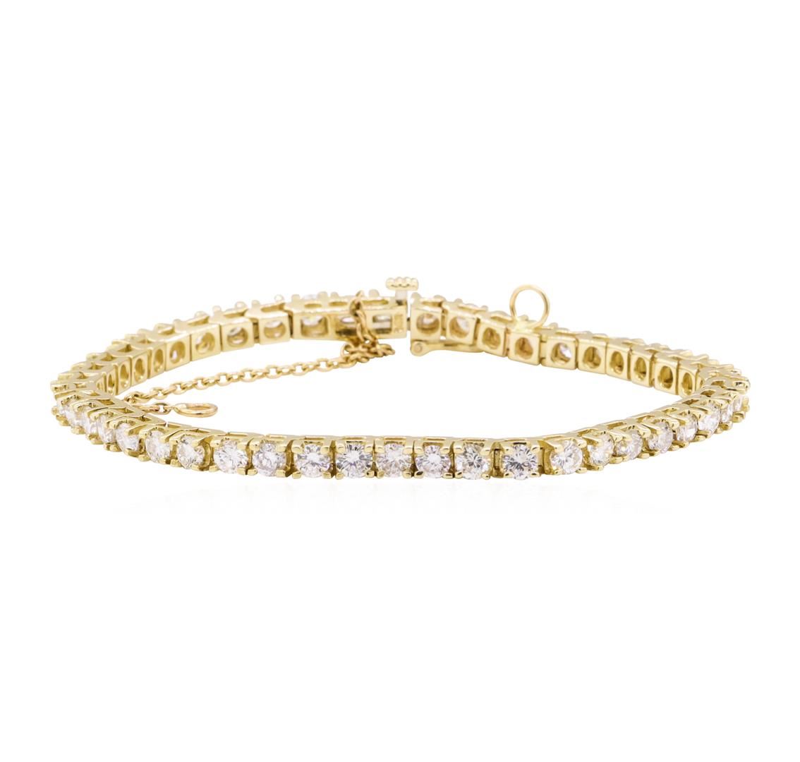 One electronically tested 14KT yellow gold lady's combination cast & assembled fashion tennis bracelet with a tongue clasp with foldover safety with a bright polish finish. The featured lady's bracelet has an attached safety chain and measures approximately six and a half inches in length. Identified with markings of '14K'. Condition is like new, good workmanship. Containing: Forty-Six prong set round brilliant cut diamonds, measuring 3.15 - 3.00 x 1.80mm (depth est.) approximate total weight of 46 Stones = 4.80ct. Graded in the setting. Color H - I Clarity SI-1 to SI-2 Cut Good. Total Weight of Diamonds 4.80ct.. Total Weight of Bracelet 12.30gm GAS Appraised at $11985.00. GAS Appraised at $11,985.00.