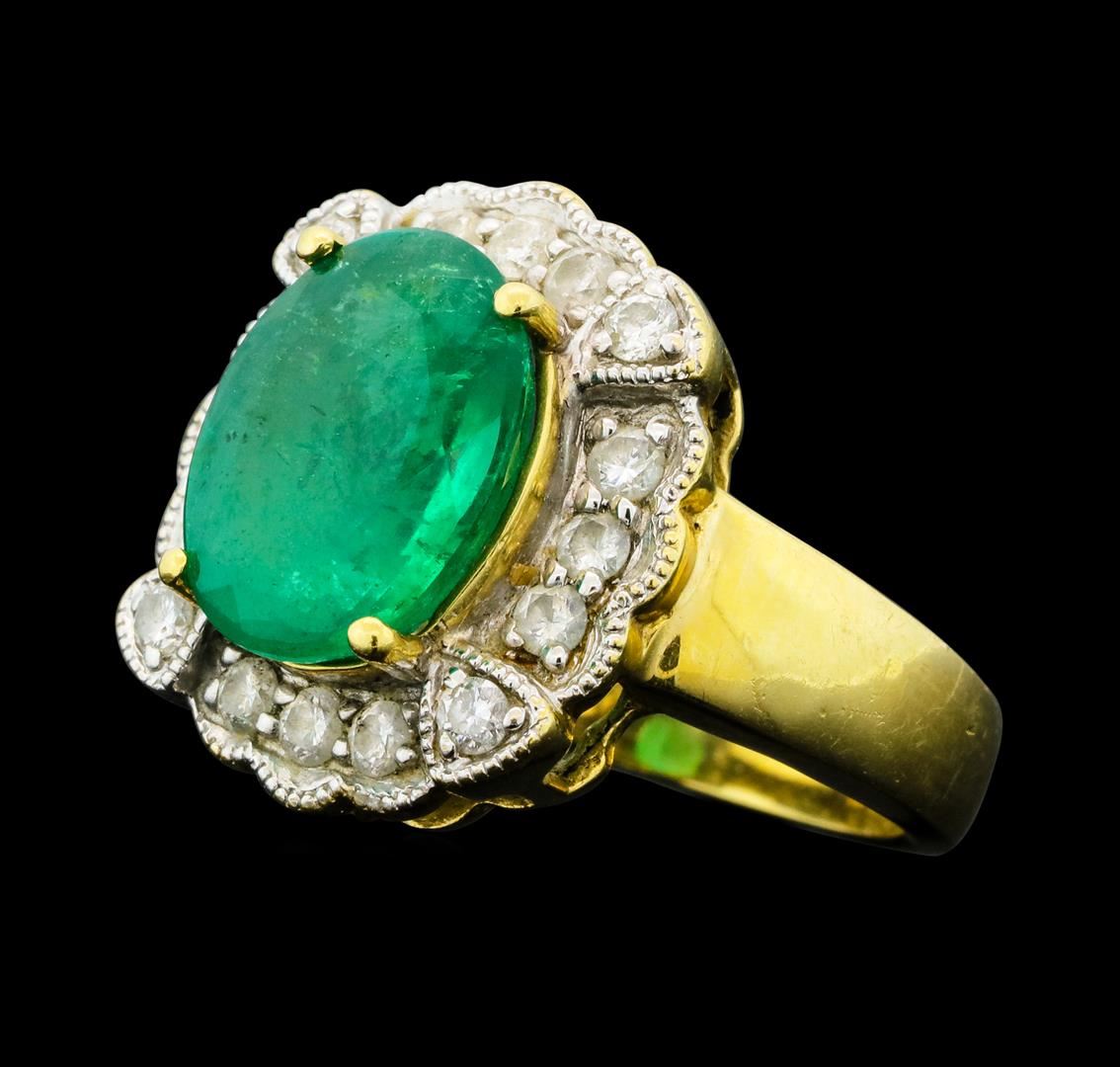 One electronically tested 14KT yellow with rhodium plating gold lady's cast fashion ring with a scalloped basket halo with a bright polish with milgrain detailing finish. The featured lady's ring has a shank measuring 2.70 millimeters wide. Identified with markings of '14K'. Condition is like new, good workmanship. Containing: One prong set oval modified brilliant cut natural emerald, measuring 11.12 x 8.80 x 5.75mm, (depth est.) approximate weight of 4.80ct., clarity is moderately included, medium dark, moderately strong, green color, (GIA G 6/4), cut is good. Transmitting light somewhat diffusely, transparent to translucent. Indications of oil residue. Naturally occurring internal & external characteristics are present. Colored gemstones are presumed to have been subjected to commonly used enhancement processes. Graded in the setting. Sixteen prong set round brilliant cut diamonds, measuring 2.00 - 1.90 x 1.21mm (depth est.) approximate total weight of 16 Stones = 0.45ct. Graded in the setting. Clarity SI-1 to I-1. Color: H - I Cut Good. Total Weight of Colored Stones 4.80ct.. Total Weight of Diamonds 0.45ct.. Total Weight of Ring 5.70gm. GAS Appraised at $10,065.00.