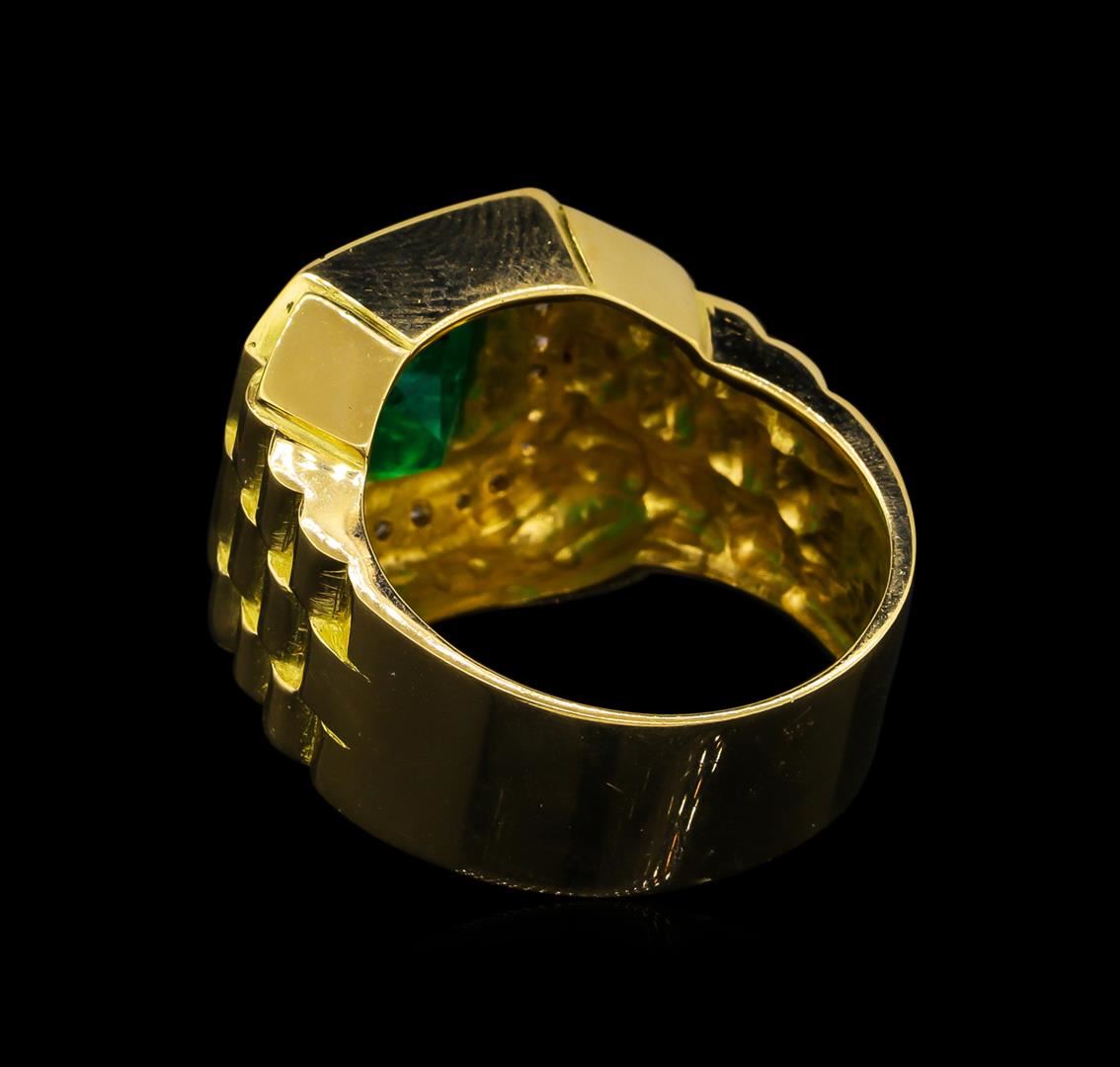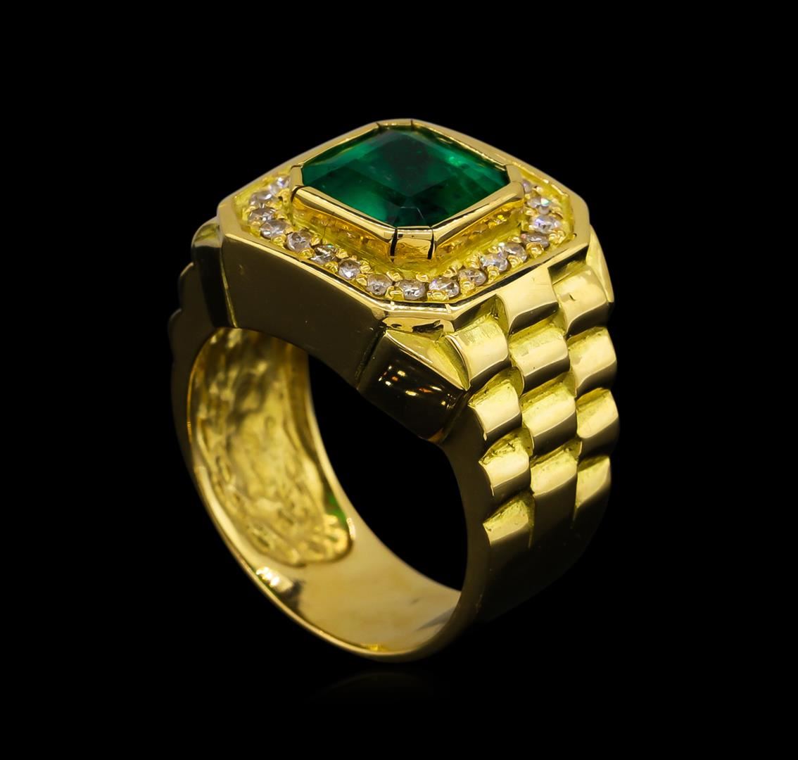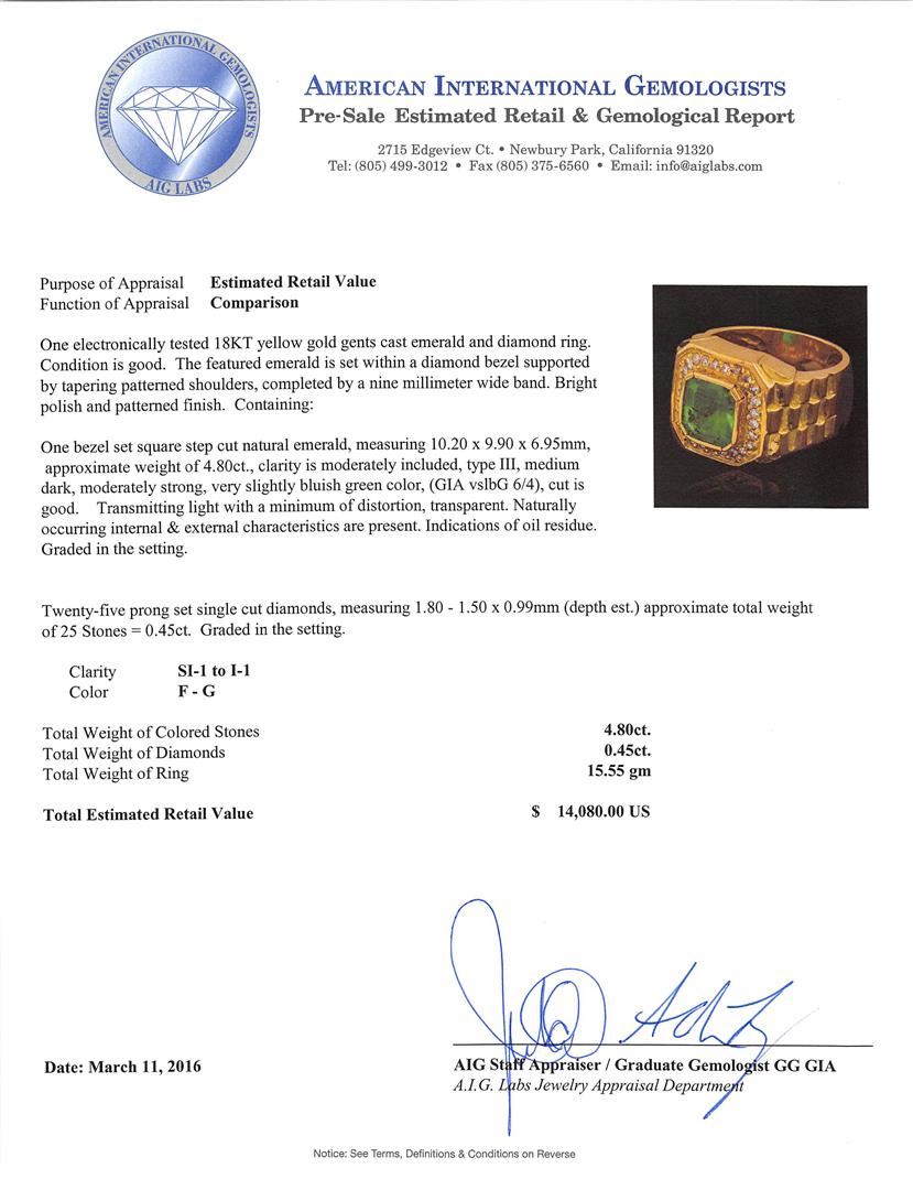 One electronically tested 18KT yellow gold gents cast emerald and diamond ring. The featured emerald is set within a diamond bezel supported by tapering patterned shoulders, completed by a nine millimeter wide band. Bright polish and patterned finish. Condition is good. Containing: One bezel set square step cut natural emerald, measuring 10.20 x 9.90 x 6.95mm, approximate weight of 4.80ct., clarity is moderately included, type III, medium dark, moderately strong, very slightly bluish green color, (GIA vslbG 6/4), cut is good. Transmitting light with a minimum of distortion, transparent. Naturally occurring internal & external characteristics are present. Indications of oil residue. Graded in the setting. Twenty-Five prong set single cut diamonds, measuring 1.80 - 1.50 x 0.99mm (depth est.) approximate total weight of 25 Stones = 0.45ct. Graded in the setting. Clarity: SI-1 to I-1. Color: F - G. Total Weight of Colored Stones 4.80ct. Total Weight of Diamonds 0.45ct. Total Weight of Ring 15.55gm. AIG Appraised at $14,080.00.