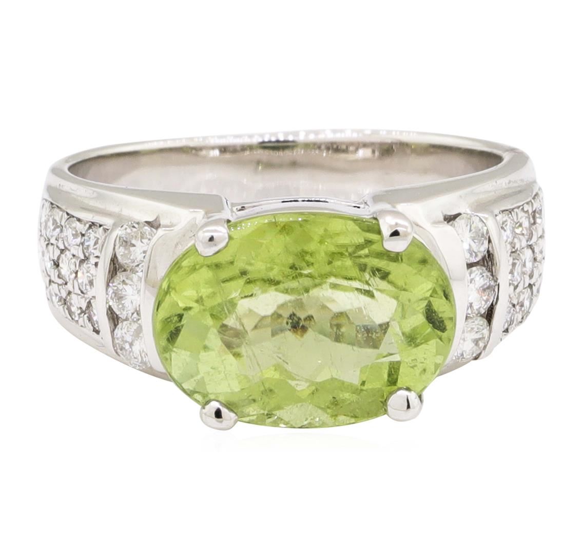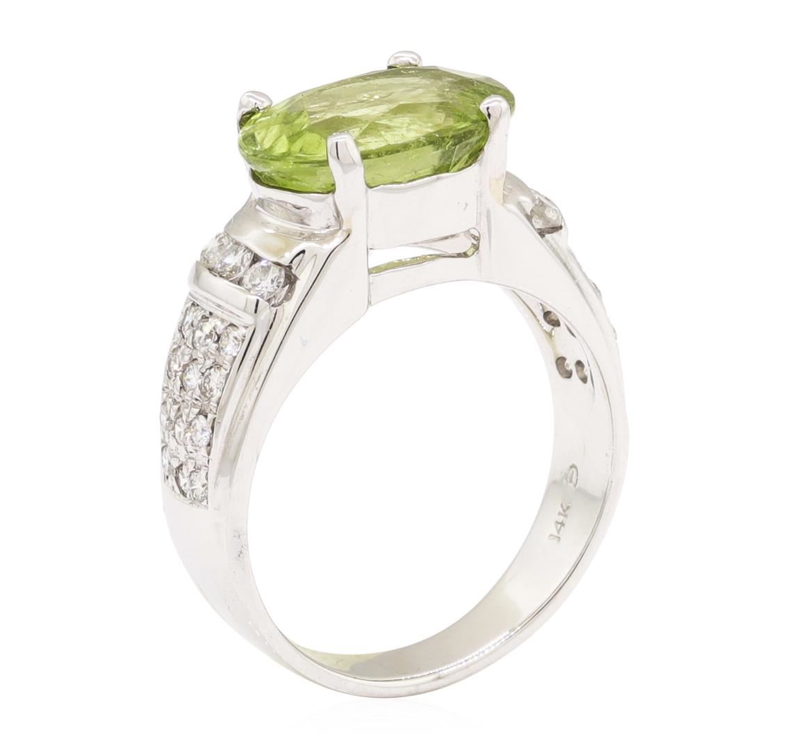 One electronically tested 14KT white gold lady's cast fashion ring with a wide band dome with a bright polish finish. The featured lady's ring has a shank measuring 4.00 millimeters. Identified with markings of '14K'. Condition is new, good workmanship. Containing: One prong set oval modified brilliant cut natural green tourmaline, measuring 12.00 x 8.77 x 6.01mm, (depth est.) 7%. bulge factor, approximate weight of 4.35ct., clarity is slightly included, light, moderately strong, yellow green color, (GIA YG 3/4), cut is very good. Colored gemstones are presumed to have been subjected to commonly used enhancement processes. GIA Gem Trade Laboratory Report #1172409544. Graded in the setting. Six channel set round brilliant cut diamonds, measuring 2.10 - 2.00 x 1.27mm (depth est.) approximate total weight of 6 Stones = 0.20ct. Graded in the setting. Color H - I Clarity SI-1 to SI-2 Cut Very Good Twenty-Four prong set round brilliant cut diamonds, measuring 1.45 - 1.40 x 0.89mm (depth est.) approximate total weight of 24 Stones = 0.25ct. Graded in the setting. Color G - I Clarity VS-2 to SI-2 Cut Good. Total Weight of Colored Stones 4.35ct.. Total Weight of Diamonds 0.45ct.. Total Weight of Ring 7.00gm GAS Appraised at $4680.00. GAS Appraised at $4,680.00.