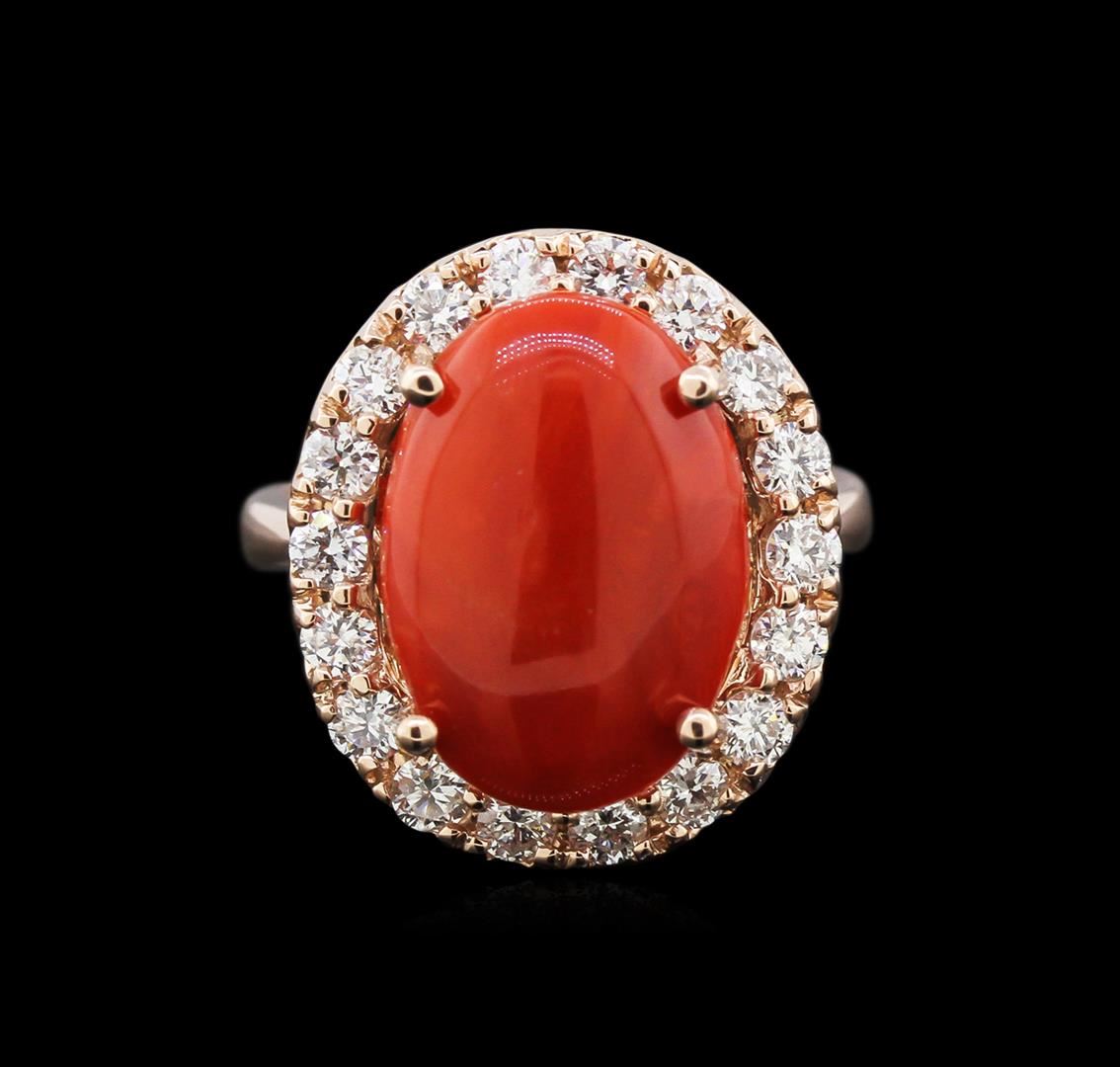 One stamped & tested 14KT rose gold lady's cast cocktail ring with a half round shank with a bright polish finish. Condition is new. Identified with markings of "14K". Containing: One prong set cabochon cut natural red coral, measuring 16.20 x 11.45 x 3.50mm, approximate weight of 4.80ct., medium dark, very slightly brownish, red orange color, (GIA RO 6/3), cut is very good. Graded in setting. Eighteen prong set round brilliant cut diamonds, measuring 2.50 - 2.45 x 1.49mm (depth est.) approximate total weight of 18 Stones = 1.04ct. Graded in setting. Clarity: SI-1 to SI-2. Color: H - I. Cut: Good. Total Weight of Colored Stones: 4.80ct. Total Weight of Diamonds: 1.04ct. Total Weight of Ring: 6.70 gm. GAS Appraised at $5,355.00.