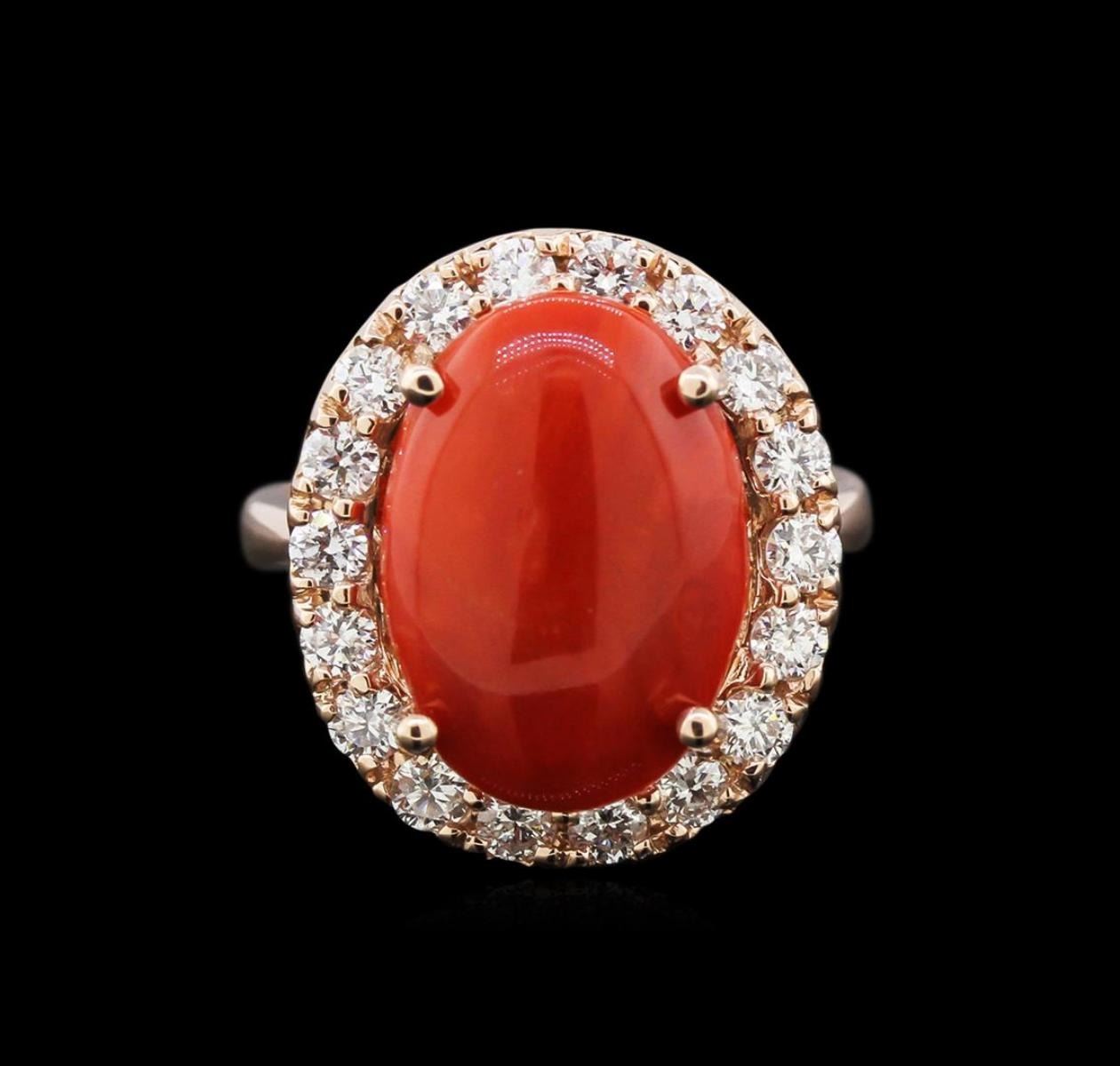 One stamped & tested 14KT rose gold lady's cast cocktail ring with a half round shank with a bright polish finish. Condition is new. Identified with markings of "14K". Containing: One prong set cabochon cut natural red coral, measuring 16.20 x 11.45 x 3.50mm, approximate weight of 4.80 ct., medium dark, very slightly brownish, red orange color, (GIA RO 6/3), cut is very good. Graded in setting. Eighteen prong set round brilliant cut diamonds, measuring 2.50 - 2.45 x 1.49mm (depth est.) approximate total weight of 18 Stones = 1.04ct. Graded in setting. Clarity: SI-1 to SI-2. Color: H - I. Cut: Good. Total Weight of Colored Stones: 4.80 ct. Total Weight of Diamonds: 1.04ct. Total Weight of Ring: 6.70 gm. GAS Appraised.