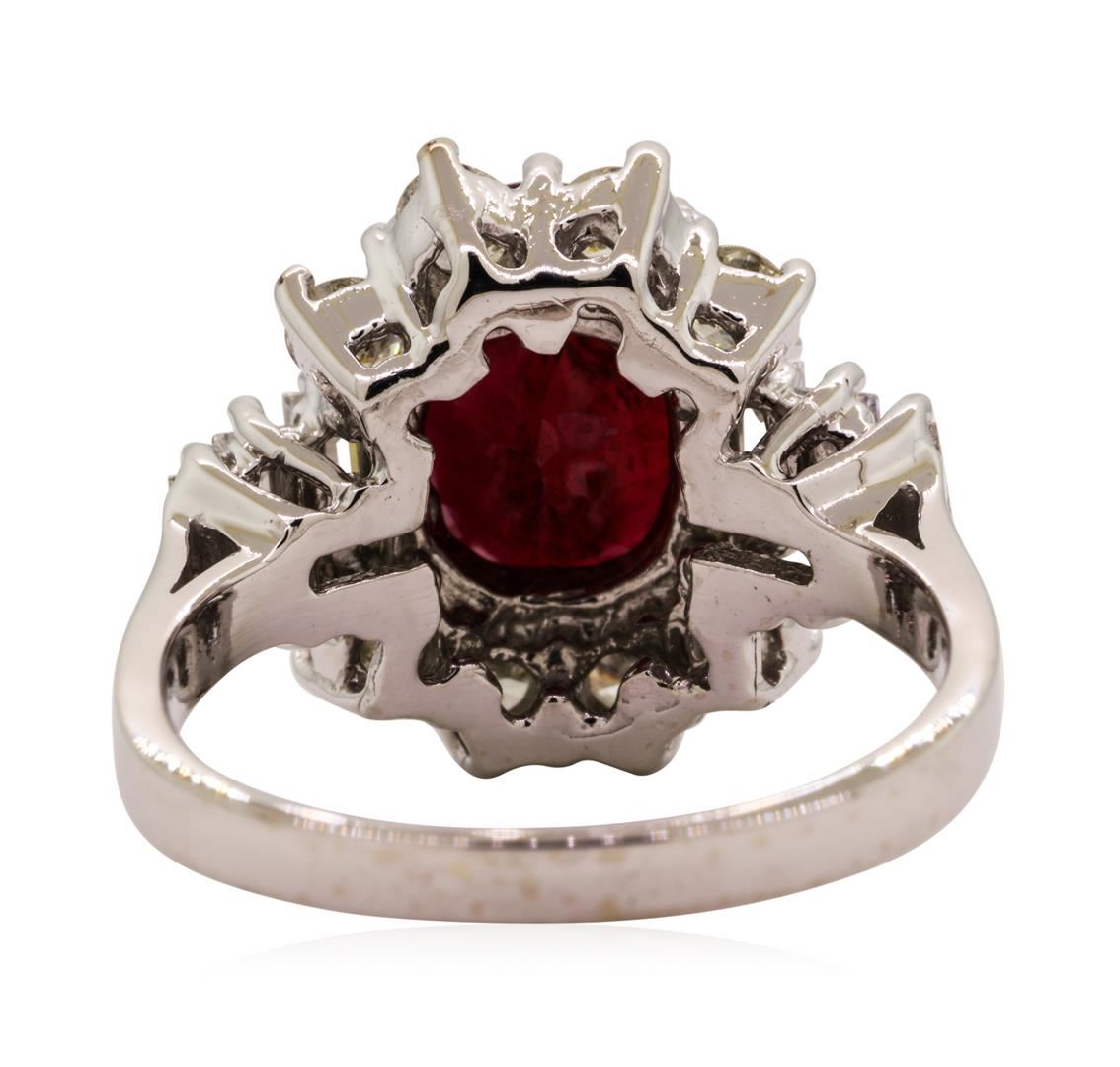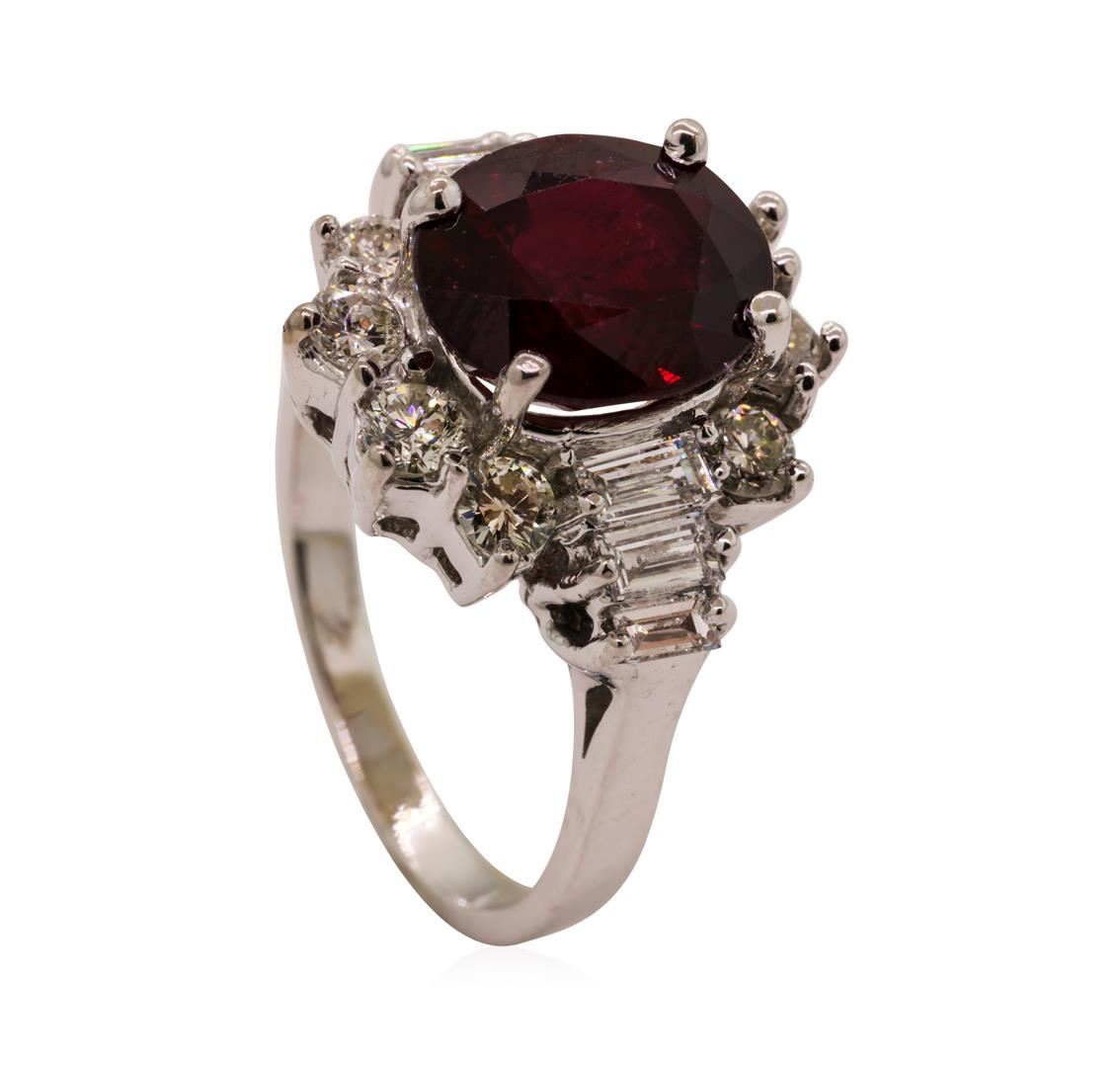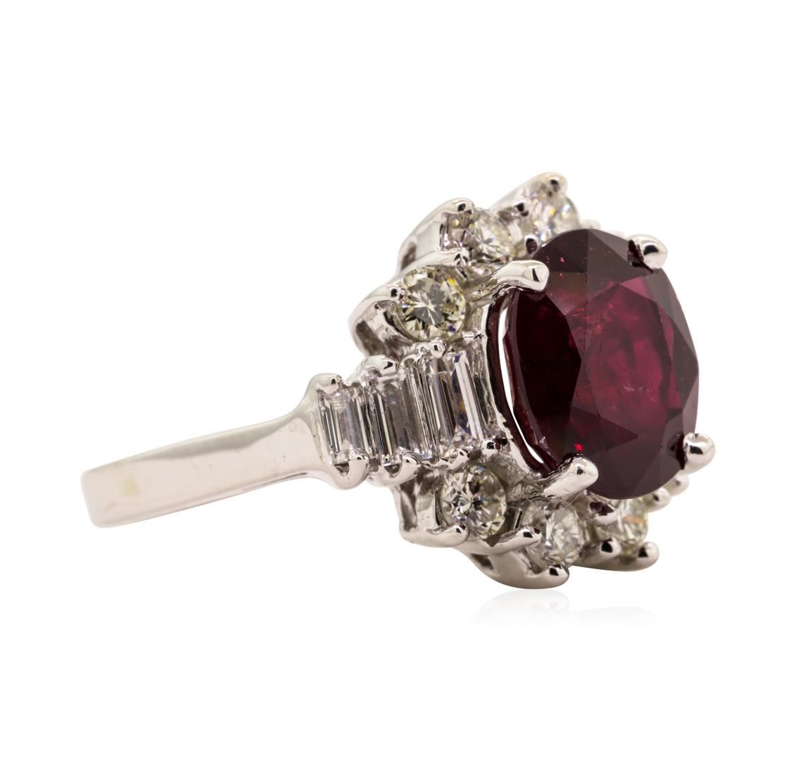 One electronically tested 14KT white gold lady's cast fashion ring with a basket halo with cathedral shank with a bright polish finish. The featured lady's ring has a shank measuring 2.15 millimeters wide. Identified with markings of '14K'. Condition is like new, good workmanship. Containing: One prong set oval modified mixed cut natural ruby, measuring 10.25 x 8.55 x 5.44mm, (depth est.) approximate weight of 4.00ct., clarity is moderately included, dark, very slightly brownish, red color, (GIA R 7/3), cut is good. Transmitting light somewhat diffusely, transparent to translucent. Naturally occurring internal & external characteristics are present. Indications of laboratory high temperature heat treatment. Colored gemstones are presumed to have been subjected to commonly used enhancement processes. Graded in the setting. Eight prong set round brilliant cut diamonds, measuring 3.00 - 2.90 x 1.83mm (depth est.) approximate total weight of 8 Stones = 0.80ct. Graded in the setting. Color H - I Clarity SI-1 to I-1 Cut Good Six prong set baguette cut diamonds, measuring from 2.60 x 1.50 x 1.28mm (depth est.) to 3.60 x 2.10 x 1.79mm (depth est.) approximate total weight of 6 Stones = 0.40ct. Graded in the setting. Color G - H Clarity VS-2 to SI-1 Cut Good. Total Weight of Colored Stones 4.00ct.. Total Weight of Diamonds 1.20ct.. Total Weight of Ring 6.30gm GAS Appraised at $6960.00. GAS Appraised at $6,960.00.