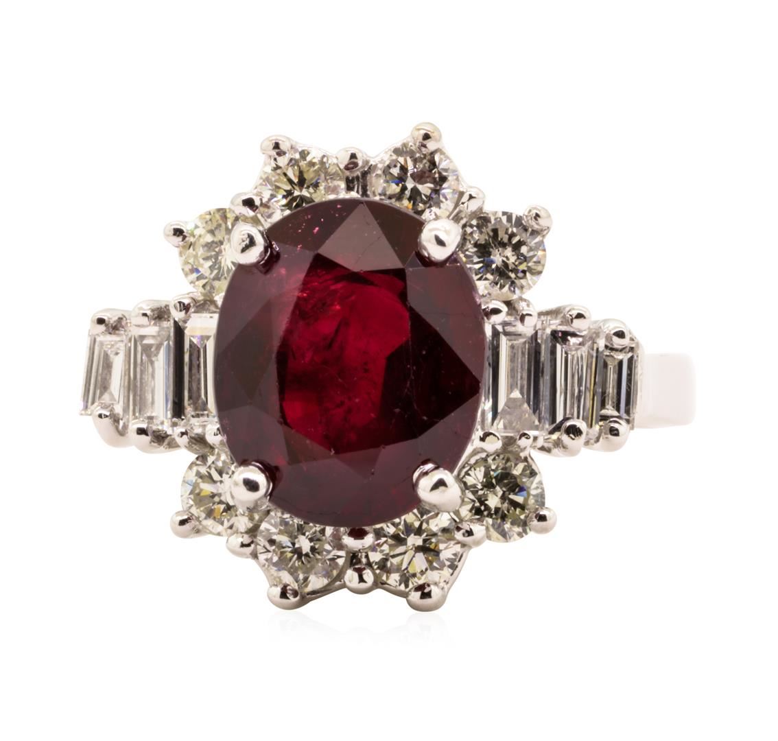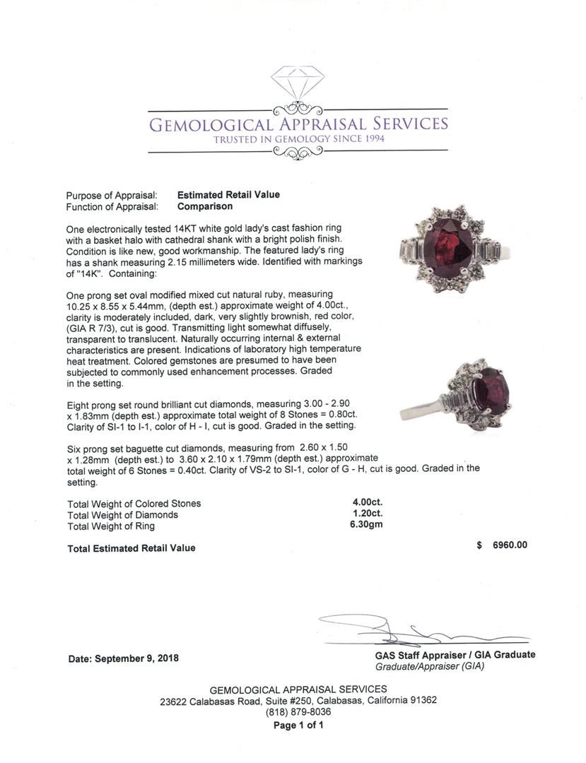 One electronically tested 14KT white gold lady's cast fashion ring with a basket halo with cathedral shank with a bright polish finish. The featured lady's ring has a shank measuring 2.15 millimeters wide. Identified with markings of '14K'. Condition is like new, good workmanship. Containing: One prong set oval modified mixed cut natural ruby, measuring 10.25 x 8.55 x 5.44mm, (depth est.) approximate weight of 4.00ct., clarity is moderately included, dark, very slightly brownish, red color, (GIA R 7/3), cut is good. Transmitting light somewhat diffusely, transparent to translucent. Naturally occurring internal & external characteristics are present. Indications of laboratory high temperature heat treatment. Colored gemstones are presumed to have been subjected to commonly used enhancement processes. Graded in the setting. Eight prong set round brilliant cut diamonds, measuring 3.00 - 2.90 x 1.83mm (depth est.) approximate total weight of 8 Stones = 0.80ct. Graded in the setting. Color H - I Clarity SI-1 to I-1 Cut Good Six prong set baguette cut diamonds, measuring from 2.60 x 1.50 x 1.28mm (depth est.) to 3.60 x 2.10 x 1.79mm (depth est.) approximate total weight of 6 Stones = 0.40ct. Graded in the setting. Color G - H Clarity VS-2 to SI-1 Cut Good. Total Weight of Colored Stones 4.00ct.. Total Weight of Diamonds 1.20ct.. Total Weight of Ring 6.30gm GAS Appraised at $6960.00. GAS Appraised at $6,960.00.