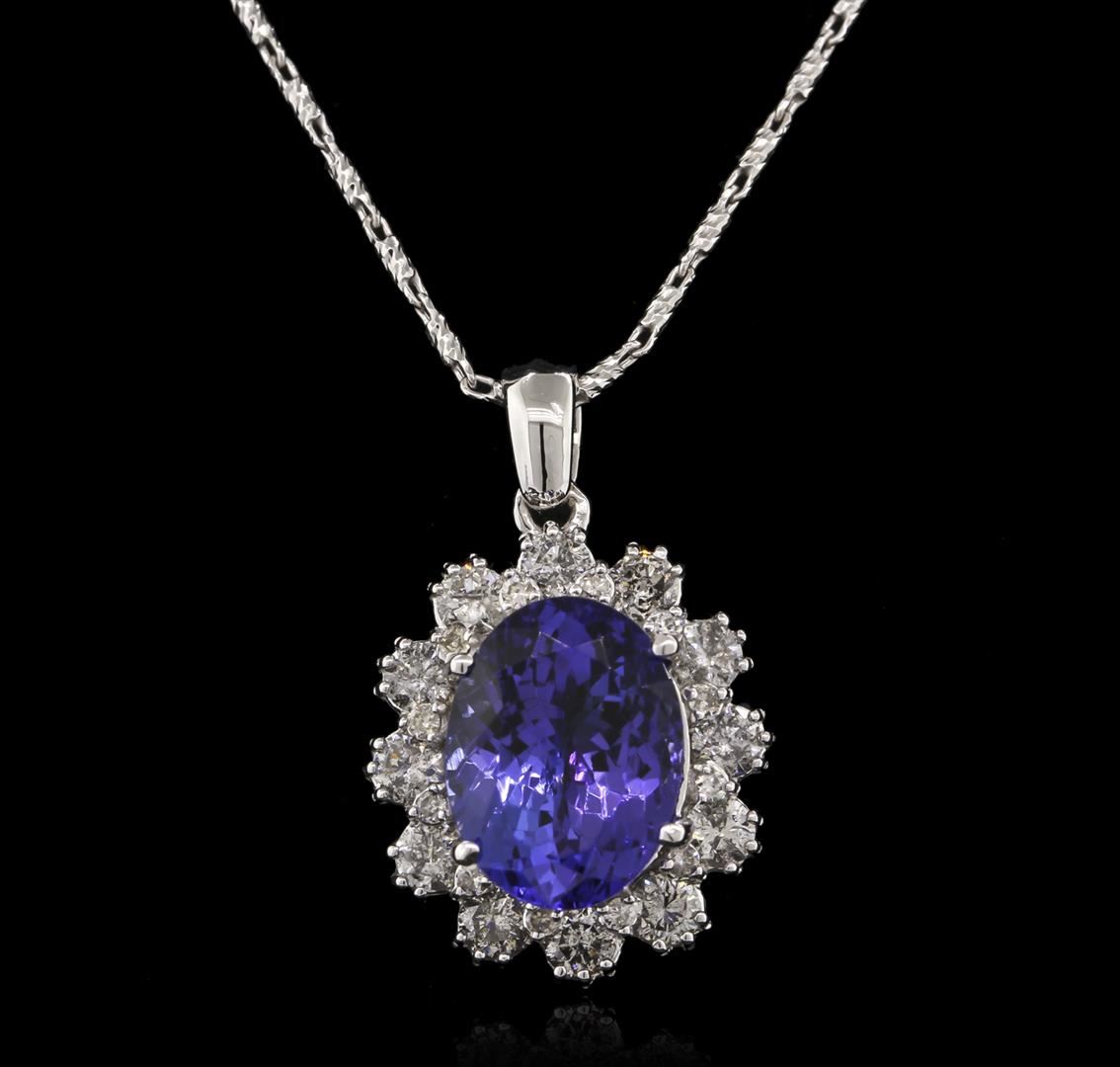 One electronically tested 14KT white gold ladies cast tanzanite and diamond pendant & chain 16.0" long, with a lobster claw clasp with a bright polish finish. Identified with markings of "14K". Condition is new. Containing: One prong set oval modified brilliant cut natural tanzanite, measuring 11.80 x 9.09 x 6.36mm, approximate weight of 4.80ct., clarity is eye clean, type I, medium light, slightly grayish, bluish violet color, (GIA bV 4/2), cut is good. Twelve prong set round brilliant cut diamonds, measuring 2.50 - 2.50 x 1.50mm (depth est.) approximate. Total Weight of 12 Stones = 0.69ct. Clarity: I-1 to I-2. Color: J - K, Cut is Good. Twelve prong set round brilliant cut diamonds, measuring 1.30 - 1.30 x 0.78mm (depth est.) approximate. Total Weight of 12 Stones = 0.10ct. Clarity: I-1 to I-2. Color: I - J, Cut is Good. Colored gemstones are presumed to have been subjected to commonly used enhancement processes. All diamonds and colored gemstones are graded in the mounting, unless otherwise stated. Total Weight of Colored Stones 4.80ct. Total Weight of Diamonds 0.78ct. Total Weight of Pendant & Chain 7.30 grams. GGL Appraised at $4,860.00.