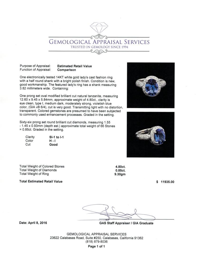 One electronically tested 14KT white gold lady's cast fashion ring with a half round shank with a bright polish finish. The featured lady's ring has a shank measuring 3.82 millimeters wide. Condition is new, good workmanship. Containing: One prong set oval modified brilliant cut natural tanzanite, measuring 12.60 x 9.45 x 5.84mm, approximate weight of 4.80ct., clarity is eye clean, type I, medium dark, moderately strong, violetish blue color, (GIA vB 6/4), cut is very good. Transmitting light with no distortion, transparent. Colored gemstones are presumed to have been subjected to commonly used enhancement processes. Graded in the setting. Sixty-Six prong set round brilliant cut diamonds, measuring 1.55 - 1.45 x 0.93mm (depth est.) approximate total weight of 66 Stones = 0.85ct. Graded in the setting. Clarity: SI-1 to I-1. Color: H - I. Cut Good. Total Weight of Colored Stones 4.80ct. Total Weight of Diamonds 0.85ct. Total Weight of Ring 9.30gm. GAS Appraised at $11,935.00.