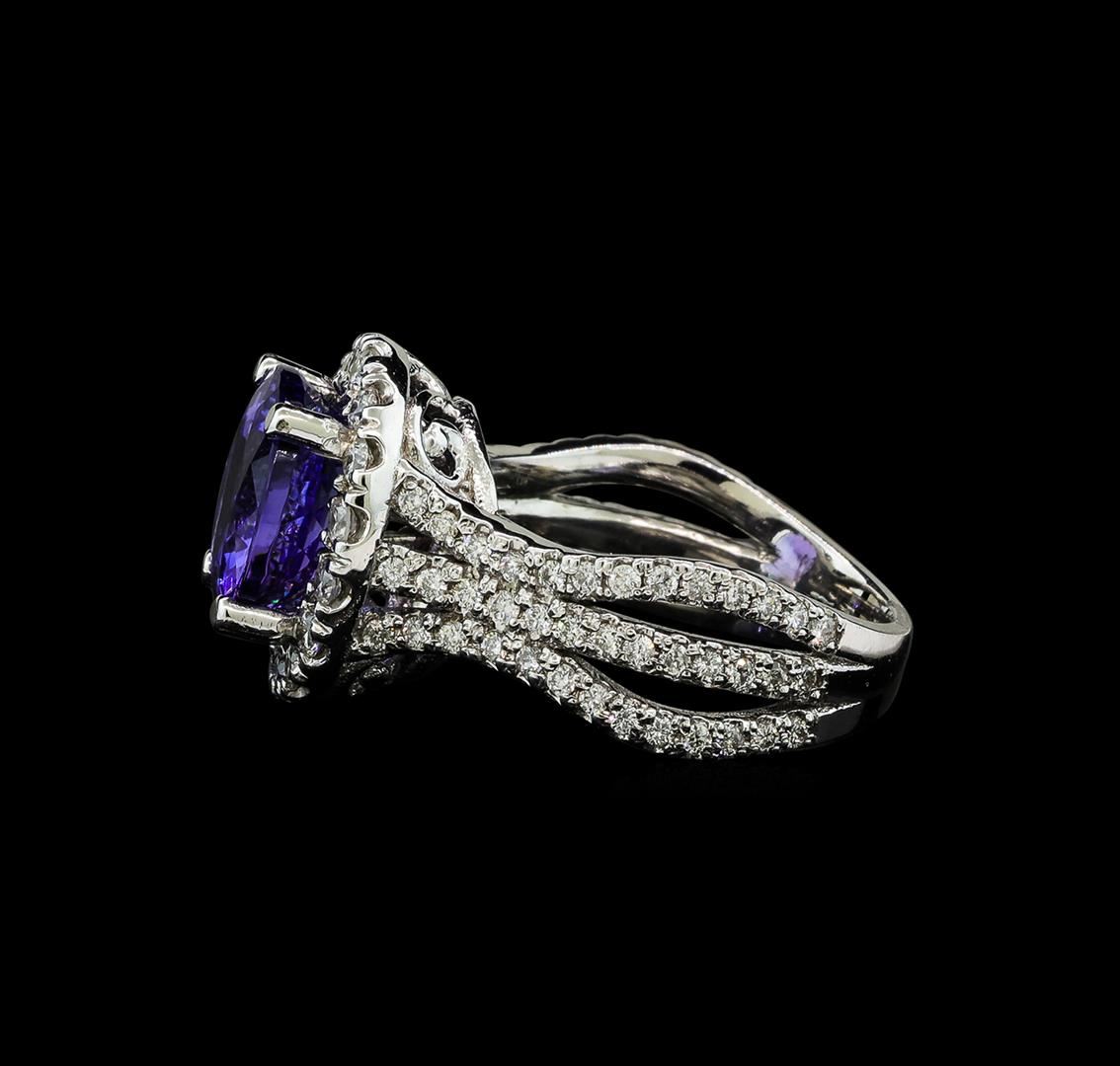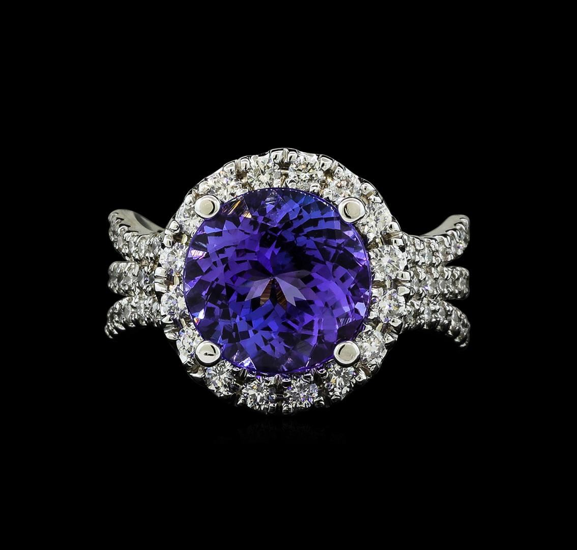 One electronically tested 14KT white gold lady's cast fashion ring with a triple split shank with a bright polish finish. The featured lady's ring has a halo and a shank measuring 3.61 millimeters wide. Identified with markings of 'K14'. Condition is new, good workmanship. Containing: One prong set round modified brilliant cut natural tanzanite, measuring 10.46 - 10.37 x 6.46 mm, (depth est.) approximate weight of 4.80ct., clarity is eye clean, medium, moderately strong, bluish violet color, (GIA bV 5/4), cut is excellent. Transmitting light with no distortion, transparent. Colored gemstones are presumed to have been subjected to commonly used enhancement processes. Graded in the setting. Sixteen prong set round brilliant cut diamonds, measuring 2.00 - 1.95 x 1.21mm (depth est.) approximate total weight of 16 Stones = 0.46ct. Graded in the setting. Clarity SI-1 to SI-2. Color: H - I Cut Good Seventy-Eight prong set round brilliant cut diamonds, measuring 1.30 - 1.25 x 0.78mm (depth est.) approximate total weight of 78 Stones = 0.60ct. Graded in the setting. Clarity SI-1 to I-1. Color: H - I Cut Good. Total Weight of Colored Stones 4.80ct.. Total Weight of Diamonds 1.06ct.. Total Weight of Ring 8.00gm GAS Appraised at $11,875.00.