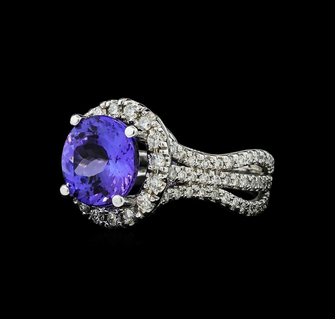 One electronically tested 14KT white gold lady's cast fashion ring with a triple split shank with a bright polish finish. The featured lady's ring has a halo and a shank measuring 3.61 millimeters wide. Identified with markings of 'K14'. Condition is new, good workmanship. Containing: One prong set round modified brilliant cut natural tanzanite, measuring 10.46 - 10.37 x 6.46 mm, (depth est.) approximate weight of 4.80ct., clarity is eye clean, medium, moderately strong, bluish violet color, (GIA bV 5/4), cut is excellent. Transmitting light with no distortion, transparent. Colored gemstones are presumed to have been subjected to commonly used enhancement processes. Graded in the setting. Sixteen prong set round brilliant cut diamonds, measuring 2.00 - 1.95 x 1.21mm (depth est.) approximate total weight of 16 Stones = 0.46ct. Graded in the setting. Clarity SI-1 to SI-2. Color: H - I Cut Good Seventy-Eight prong set round brilliant cut diamonds, measuring 1.30 - 1.25 x 0.78mm (depth est.) approximate total weight of 78 Stones = 0.60ct. Graded in the setting. Clarity SI-1 to I-1. Color: H - I Cut Good. Total Weight of Colored Stones 4.80ct.. Total Weight of Diamonds 1.06ct.. Total Weight of Ring 8.00gm GAS Appraised at $11,875.00.