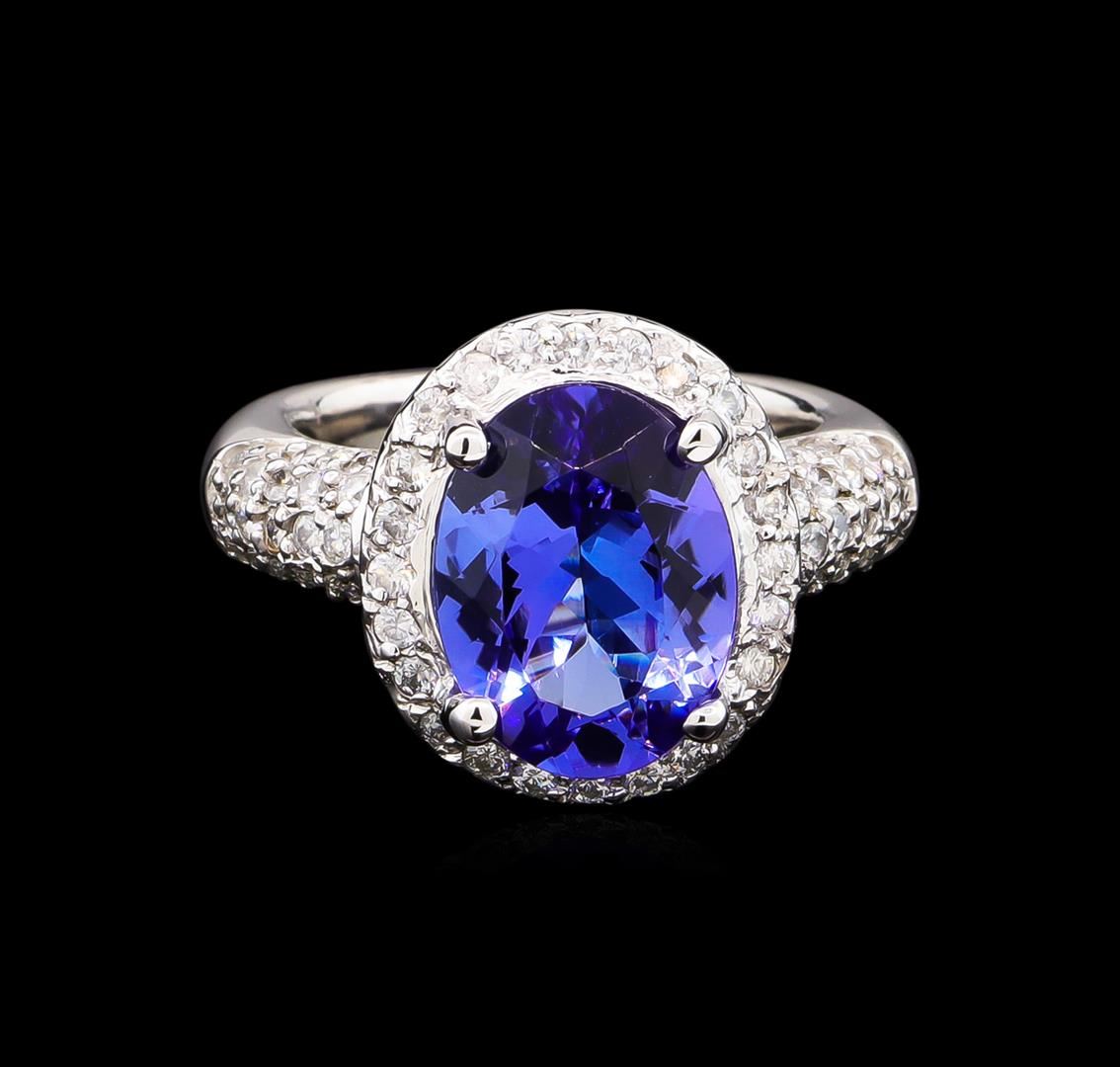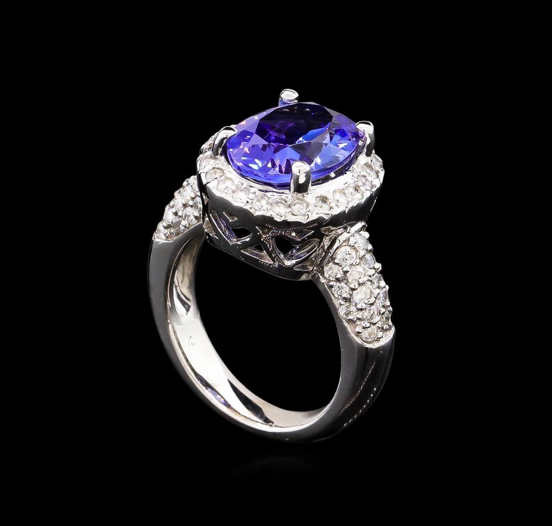 One electronically tested 14KT white gold lady's cast fashion ring with a half round shank with a bright polish finish. The featured lady's ring has a shank measuring 3.82 millimeters wide. Condition is new, good workmanship. Containing: One prong set oval modified brilliant cut natural tanzanite, measuring 12.60 x 9.45 x 5.84mm, approximate weight of 4.80ct., clarity is eye clean, type I, medium dark, moderately strong, violetish blue color, (GIA vB 6/4), cut is very good. Transmitting light with no distortion, transparent. Colored gemstones are presumed to have been subjected to commonly used enhancement processes. Graded in the setting. Sixty-Six prong set round brilliant cut diamonds, measuring 1.55 - 1.45 x 0.93mm (depth est.) approximate total weight of 66 Stones = 0.85ct. Graded in the setting. Clarity: SI-1 to I-1. Color: H - I. Cut Good. Total Weight of Colored Stones 4.80ct. Total Weight of Diamonds 0.85ct. Total Weight of Ring 9.30gm. GAS Appraised at $11,935.00.
