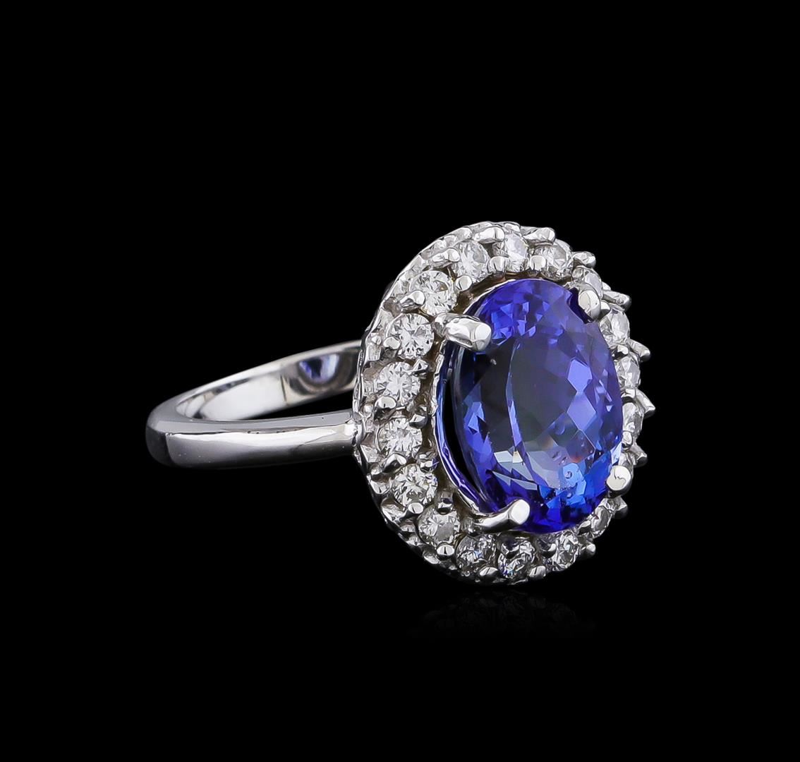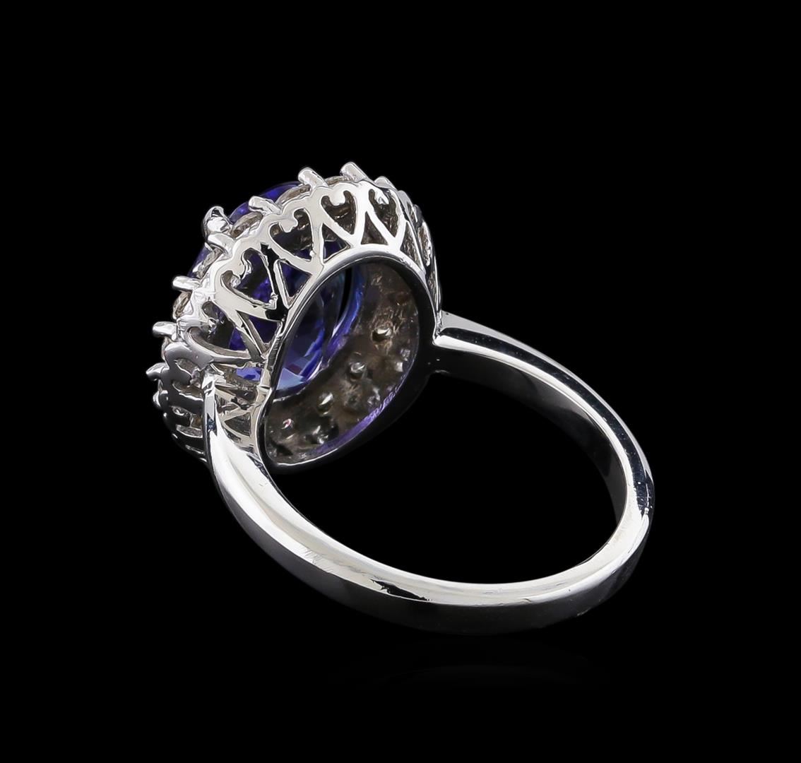 One electronically tested 14KT white gold lady's cast fashion ring with a basket halo with a bright polish finish. The featured lady's ring has a shank measuring 2.39 millimeters wide. Identified with markings of "14K". Condition is new, good workmanship. Containing: One prong set oval modified brilliant cut natural tanzanite, measuring 11.62 x 8.53 x 6.49mm, 6%. bulge factor, approximate weight of 4.80ct., clarity is eye clean, type I, medium dark, moderately strong, violetish blue color, (GIA vB 6/4), cut is very good. Transmitting light with no distortion, transparent. Colored gemstones are presumed to have been subjected to commonly used enhancement processes. Graded in the setting. Eighteen prong set round brilliant cut diamonds, measuring 2.10 - 2.00 x 1.25mm (depth est.) approximate total weight of 18 Stones = 0.58ct. Graded in the setting. Clarity: SI-1 to SI-2. Color: H - I. Cut Good. Total Weight of Colored Stones 4.80ct. Total Weight of Diamonds 0.58ct. Total Weight of Ring 6.30gm. GAS Appraised at $10,445.00.