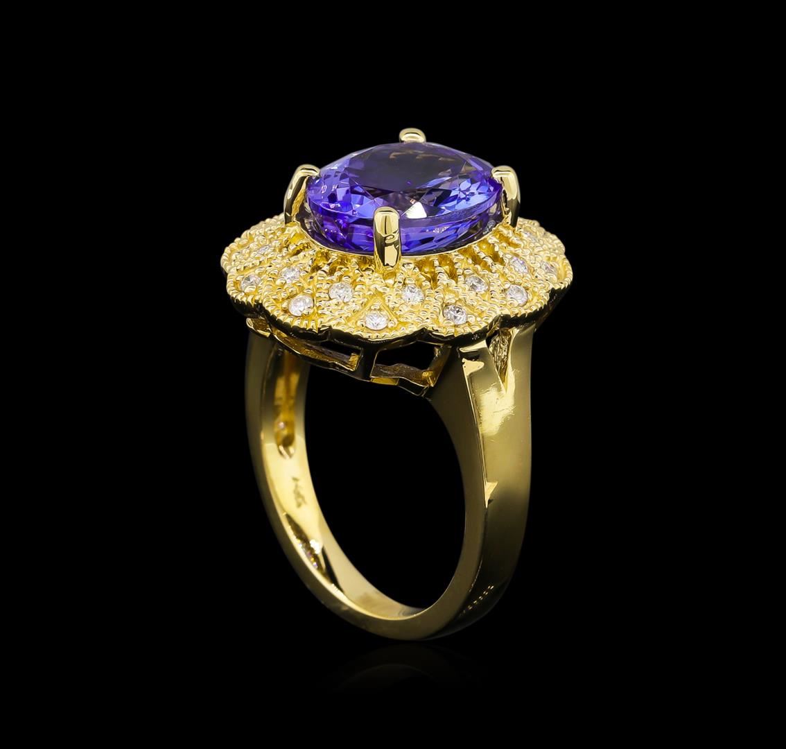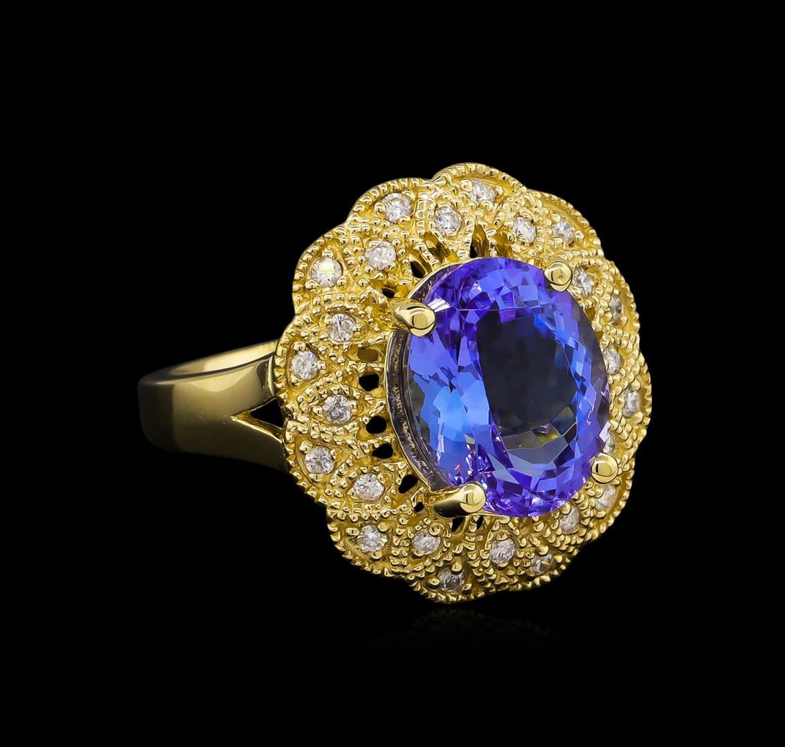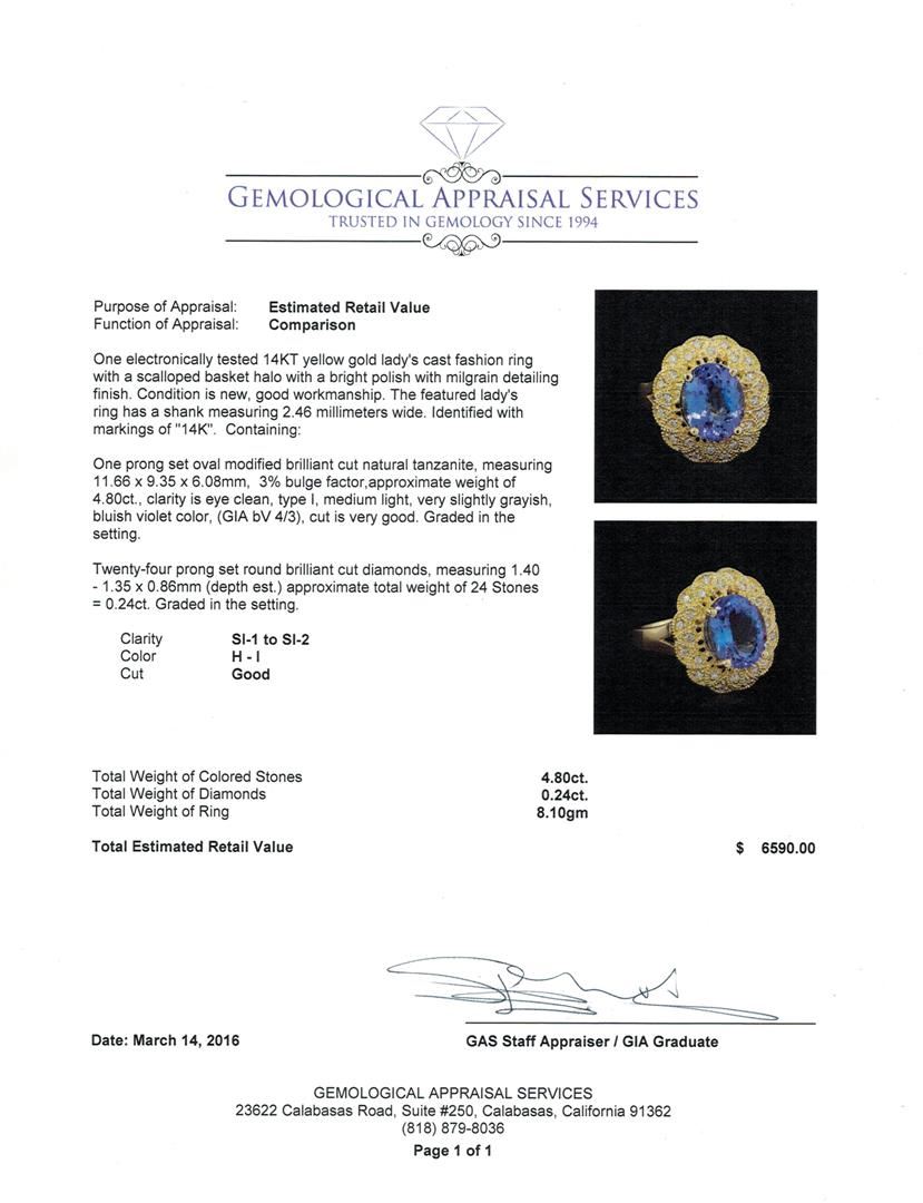 One electronically tested 14KT yellow gold lady's cast fashion ring with a scalloped basket halo with a bright polish with milgrain detailing finish. The featured lady's ring has a shank measuring 2.46 millimeters wide. Identified with markings of "14K". Condition is new, good workmanship. Containing: One prong set oval modified brilliant cut natural tanzanite, measuring 11.66 x 9.35 x 6.08mm, 3%. bulge factor, approximate weight of 4.80ct., clarity is eye clean, type I, medium light, very slightly grayish, bluish violet color, (GIA bV 4/3), cut is very good. Graded in the setting. Twenty-Four prong set round brilliant cut diamonds, measuring 1.40 - 1.35 x 0.86mm (depth est.) approximate total weight of 24 Stones = 0.24ct. Graded in the setting. Clarity: SI-1 to SI-2. Color: H - I. Cut Good. Total Weight of Colored Stones 4.80ct. Total Weight of Diamonds 0.24ct. Total Weight of Ring 8.10gm. GAS Appraised at $6,590.00.