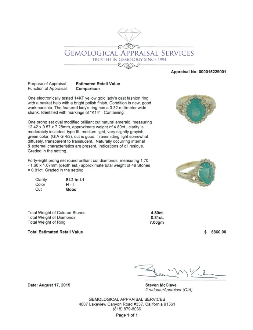 One electronically tested 14KT yellow gold lady's cast fashion ring with a basket halo with a bright polish finish. The featured lady's ring has a 3.32 millimeter wide shank. Identified with markings of "K14". Condition is new, good workmanship. Containing: One prong set oval modified brilliant cut natural emerald, measuring 12.42 x 9.57 x 7.28mm, approximate weight of 4.80ct., clarity is moderately included, type III, medium light, very slightly grayish, green color, (GIA G 4/3), cut is good. Transmitting light somewhat diffusely, transparent to translucent. Naturally occurring internal & external characteristics are present. Indications of oil residue. Graded in the setting. Forty-Eight prong set round brilliant cut diamonds, measuring 1.70 - 1.60 x 1.07mm (depth est.) approximate total weight of 48 Stones = 0.81ct. Graded in the setting. Clarity: SI-2 to I-1. Color: H - I. Cut Good. Total Weight of Colored Stones 4.80ct. Total Weight of Diamonds 0.81ct. Total Weight of Ring 7.00gm. GAS Appraised at $6,860.00.