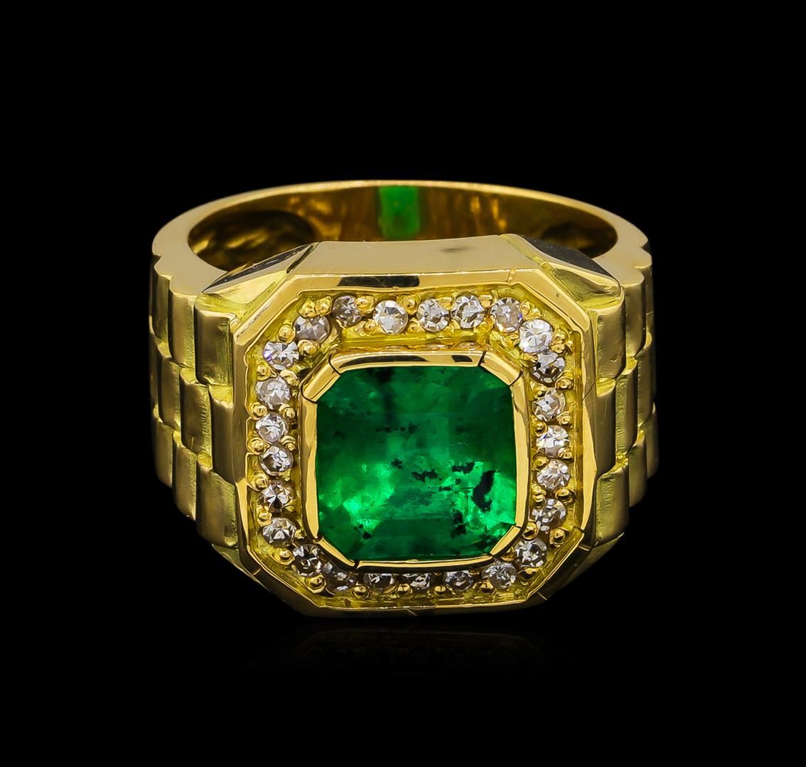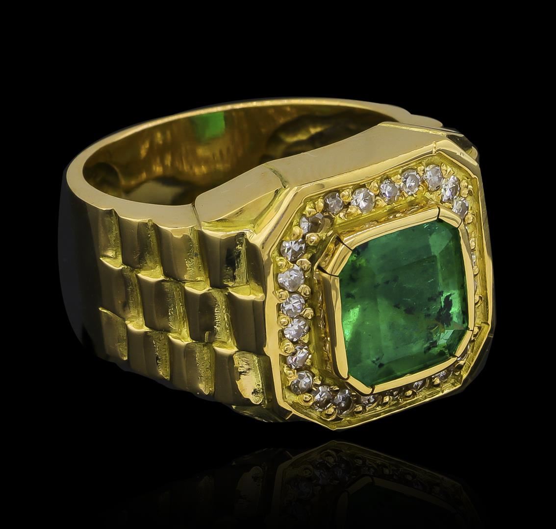 One electronically tested 18KT yellow gold gents cast emerald and diamond ring. The featured emerald is set within a diamond bezel supported by tapering patterned shoulders, completed by a nine millimeter wide band. Bright polish and patterned finish. Condition is good. Containing: One bezel set square step cut natural emerald, measuring 10.20 x 9.90 x 6.95mm, approximate weight of 4.80ct., clarity is moderately included, type III, medium dark, moderately strong, very slightly bluish green color, (GIA vslbG 6/4), cut is good. Transmitting light with a minimum of distortion, transparent. Naturally occurring internal & external characteristics are present. Indications of oil residue. Graded in the setting. Twenty-Five prong set single cut diamonds, measuring 1.80 - 1.50 x 0.99mm (depth est.) approximate total weight of 25 Stones = 0.45ct. Graded in the setting. Clarity: SI-1 to I-1. Color: F - G. Total Weight of Colored Stones 4.80ct. Total Weight of Diamonds 0.45ct. Total Weight of Ring 15.55gm. AIG Appraised at $14,080.00.