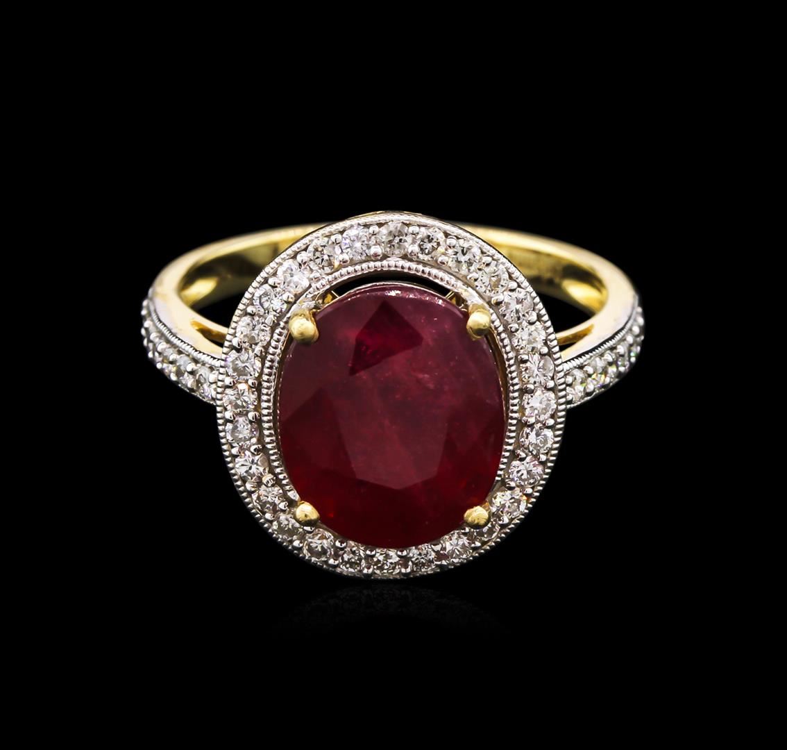 One electronically tested yellow gold ladies cast ruby and diamond ring. Condition is new, good workmanship. The featured ruby is set within a diamond bezel supported by diamond set shoulders, completed by a two millimeter wide band. Bright polish finish with rhodium accents and milgrain detailing. Trademark is Orianne. Identified with markings of" 14K". Containing: One prong set oval mixed cut natural ruby, measuring 10.66 x 8.84 x 4.93mm, 15% bulge factor, approximate weight of 4.80ct., clarity is heavily included, type II, medium dark, very slightly brownish, slightly purplish red color,(GIA slpR 6/3), cut is good. Transmitting light somewhat diffusely, transparent to translucent. Naturally occurring internal & external characteristics are present. Indications of laboratory high temperature heat treatment, with glass & flux additives. Graded in the setting. Ruby has a low tolerance to rhodium plating, repolishing the surface, & ultrasonic cleaning. Forty-two prong set round brilliant cut diamonds, measuring 1.50 - 1.40 x 0.87mm (depth est.) approximate total weight of 42 Stones = 0.5let. Graded in the setting. Clarity: SI-1 to I-1.Color: G - I. AIG Appraised at $3,190.00.