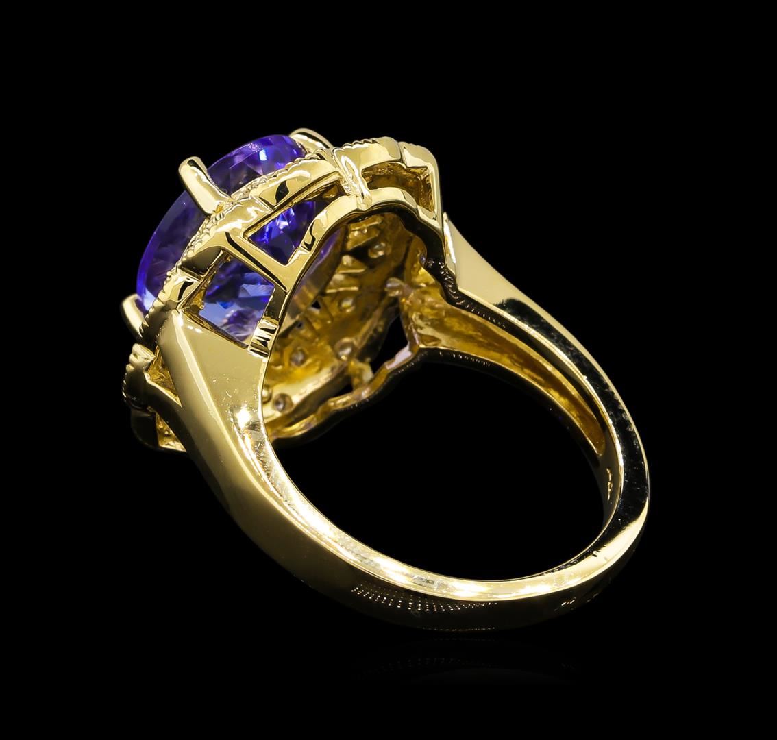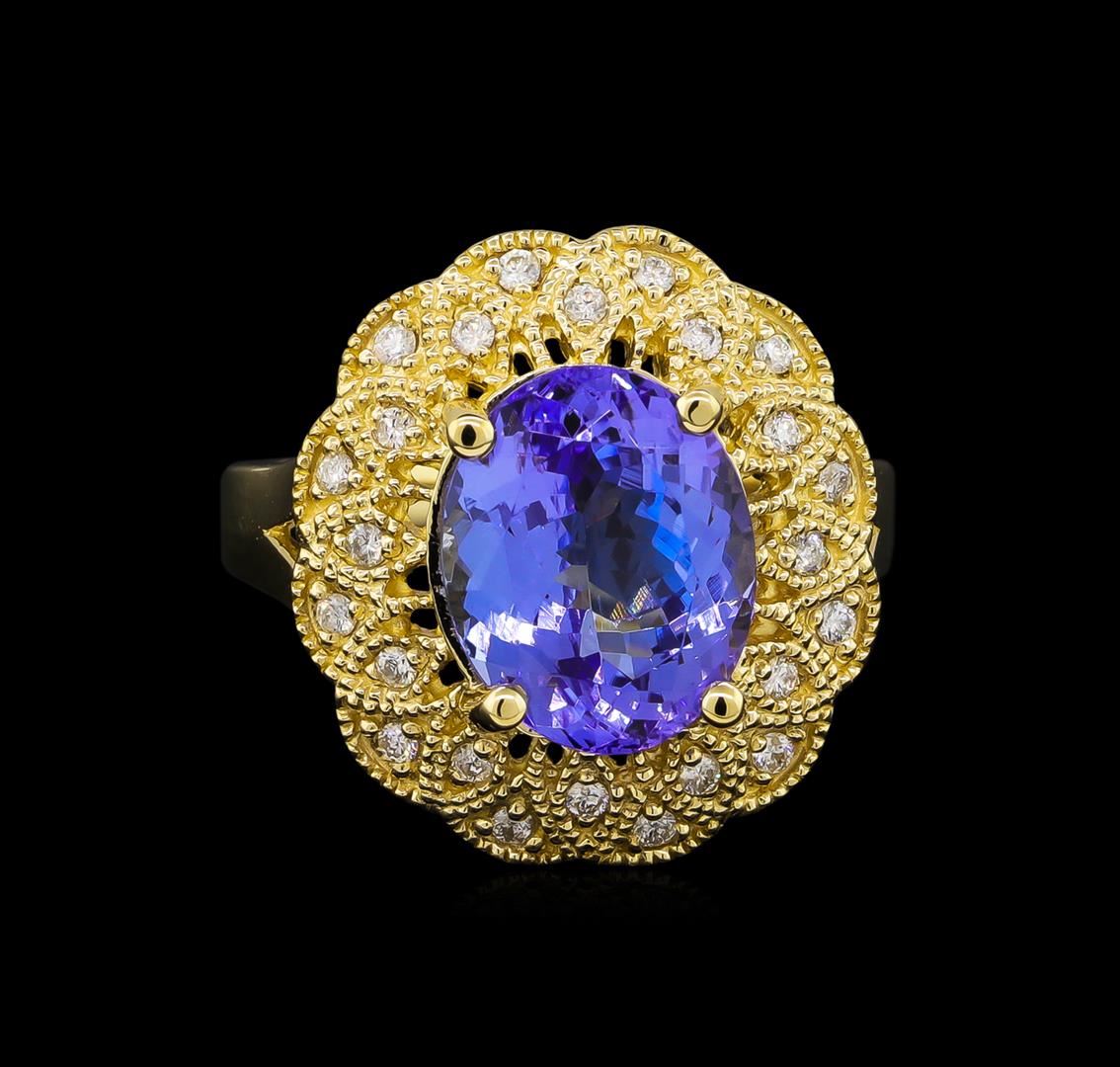 One electronically tested 14KT yellow gold lady's cast fashion ring with a scalloped basket halo with a bright polish with milgrain detailing finish. The featured lady's ring has a shank measuring 2.46 millimeters wide. Identified with markings of "14K". Condition is new, good workmanship. Containing: One prong set oval modified brilliant cut natural tanzanite, measuring 11.66 x 9.35 x 6.08mm, 3%. bulge factor, approximate weight of 4.80ct., clarity is eye clean, type I, medium light, very slightly grayish, bluish violet color, (GIA bV 4/3), cut is very good. Graded in the setting. Twenty-Four prong set round brilliant cut diamonds, measuring 1.40 - 1.35 x 0.86mm (depth est.) approximate total weight of 24 Stones = 0.24ct. Graded in the setting. Clarity: SI-1 to SI-2. Color: H - I. Cut Good. Total Weight of Colored Stones 4.80ct. Total Weight of Diamonds 0.24ct. Total Weight of Ring 8.10gm. GAS Appraised at $6,590.00.