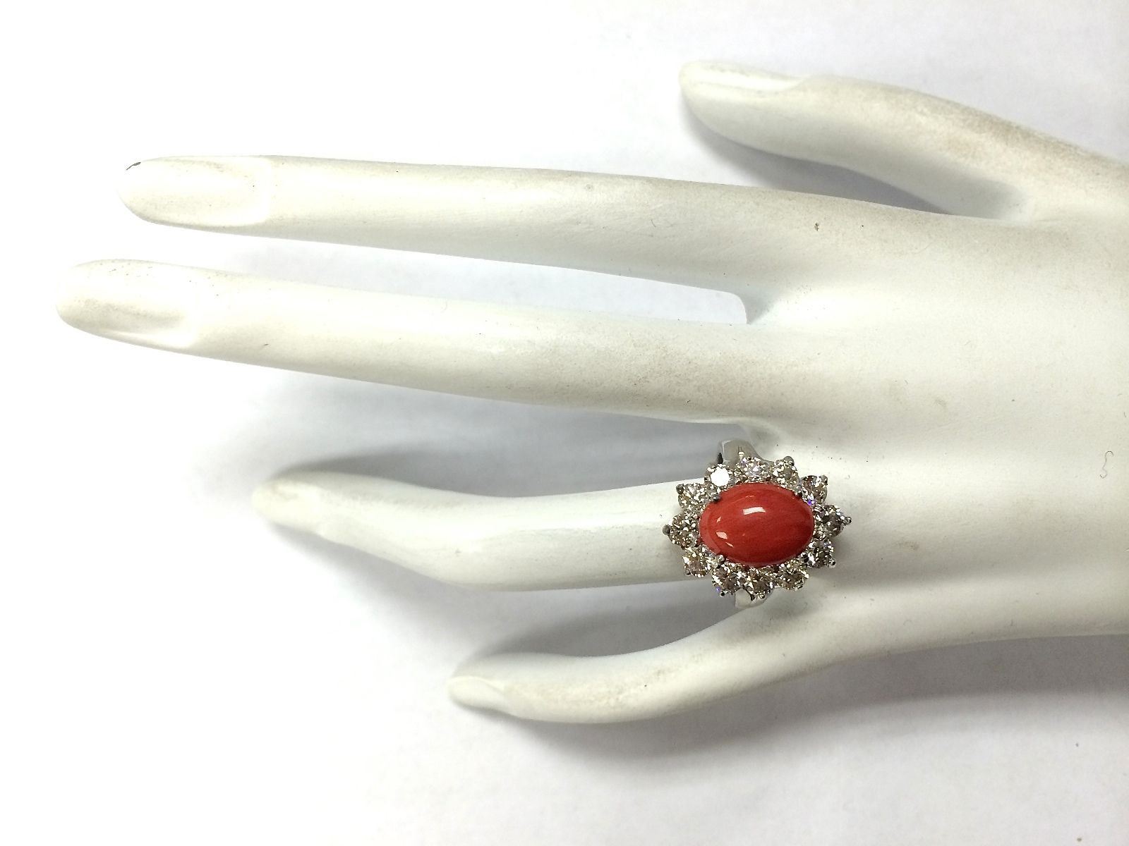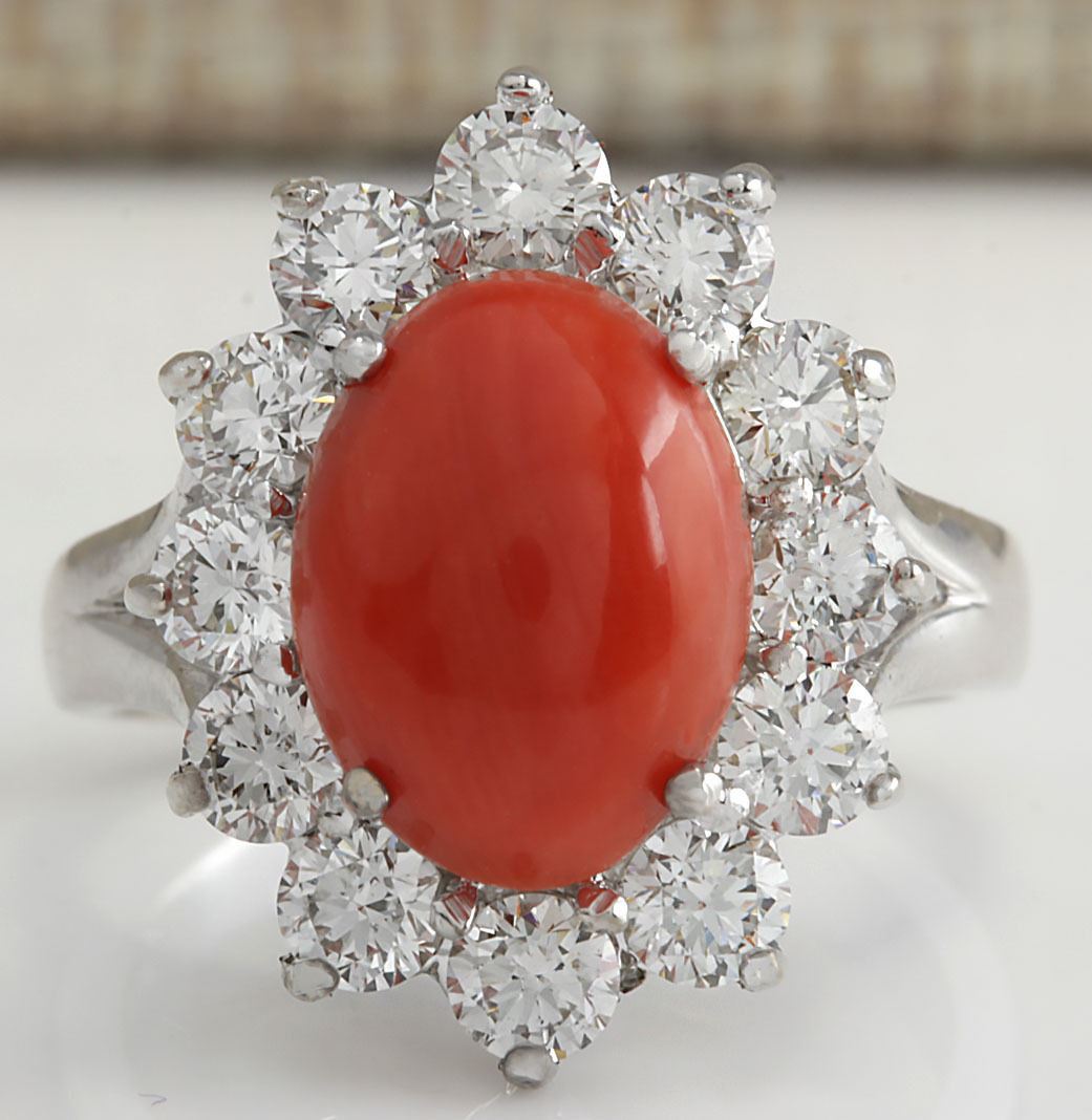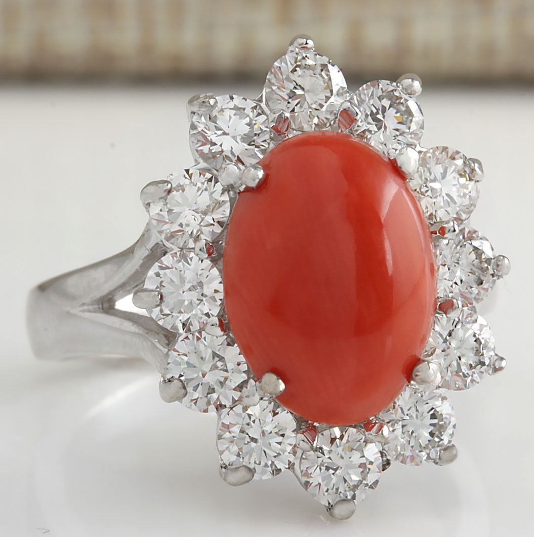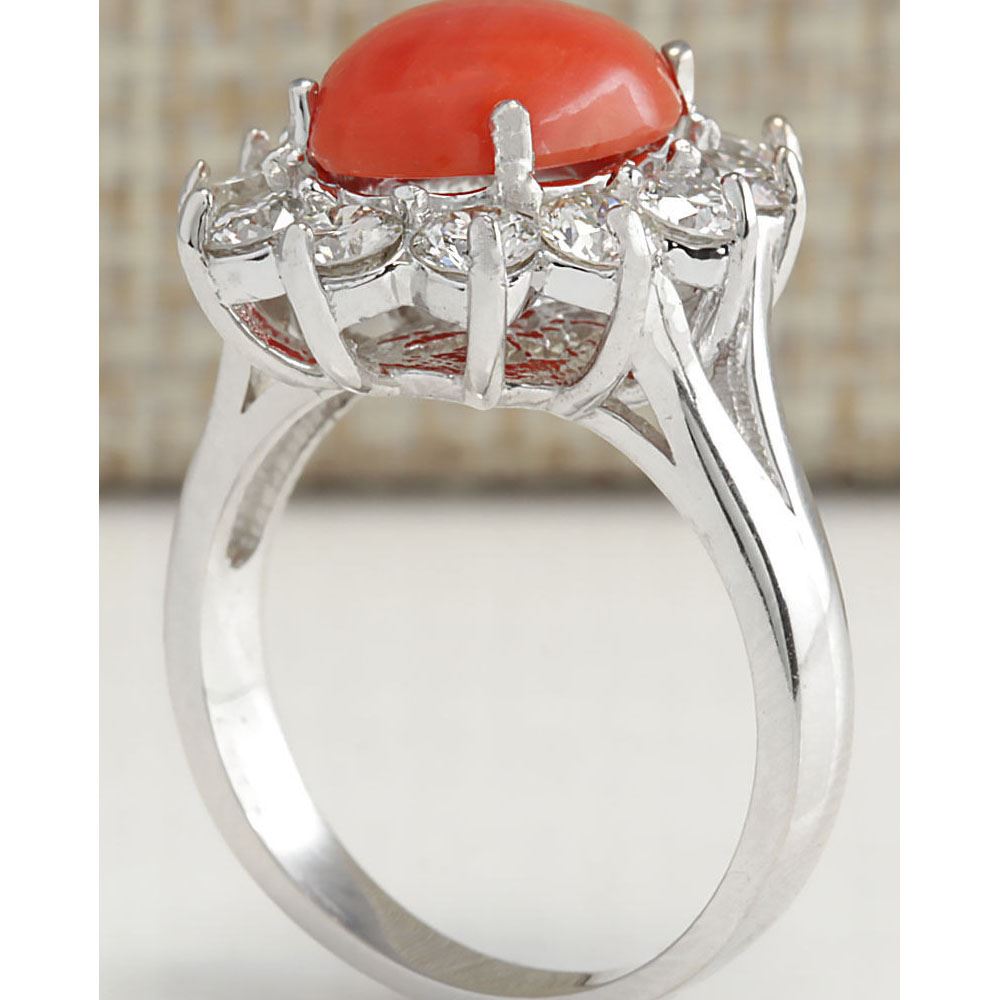 4.81 CTW Natural Red Coral And Diamond Ring In 14K White Gold