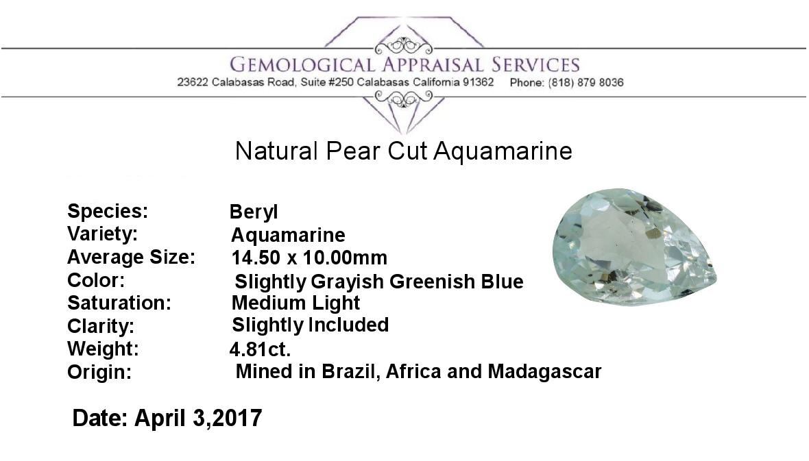 One natural pear cut aquamarine with an exact weight of 4.81ct., clarity is slightly included, slightly grayish greenish blue, medium light. Gemological Appraisals Services estimates the retail value at $1515.15 GAS Appraised.