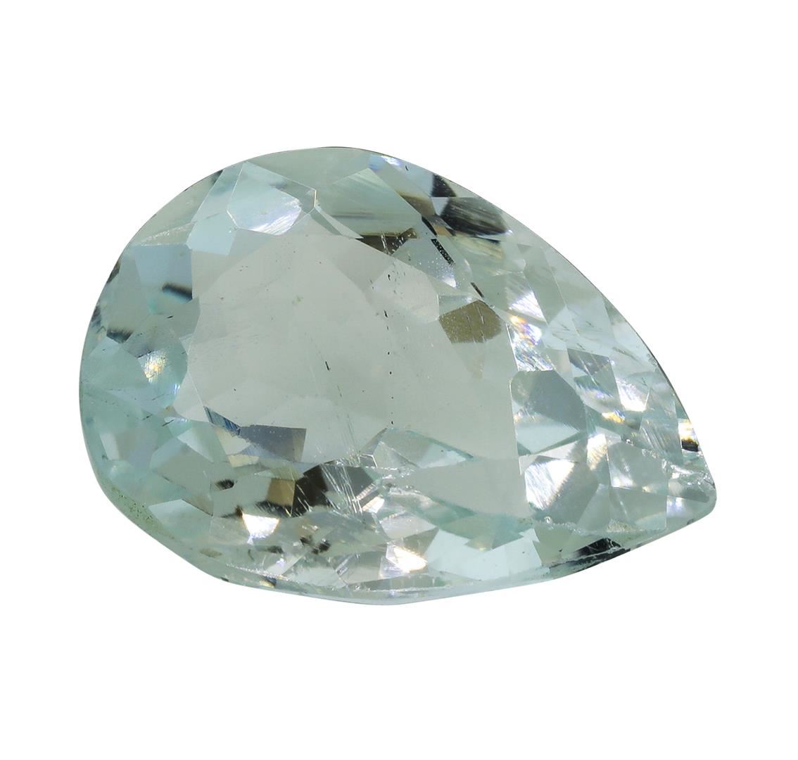 One natural pear cut aquamarine with an exact weight of 4.81ct., clarity is slightly included, slightly grayish greenish blue, medium light. Gemological Appraisals Services estimates the retail value at $1515.15 GAS Appraised.