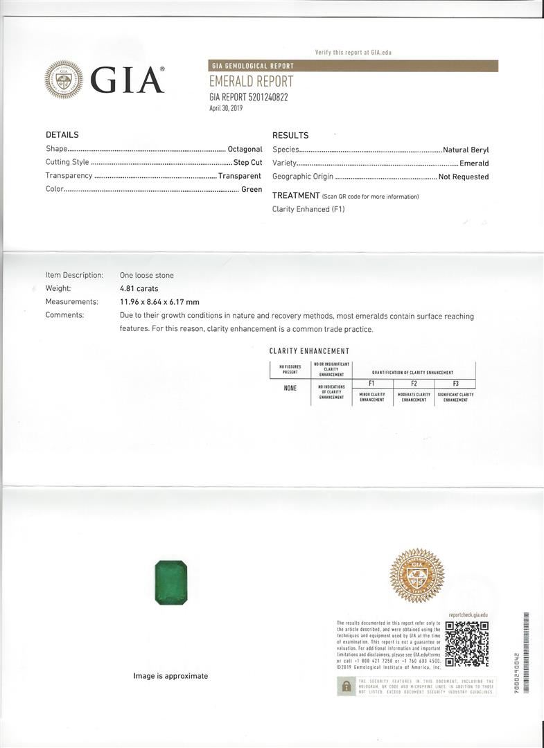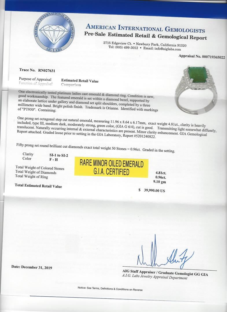 One 4.81ct Emerald and Diamond Ring - Platinum. AIG certified. See Appraisal for more details. AIG Appraised.