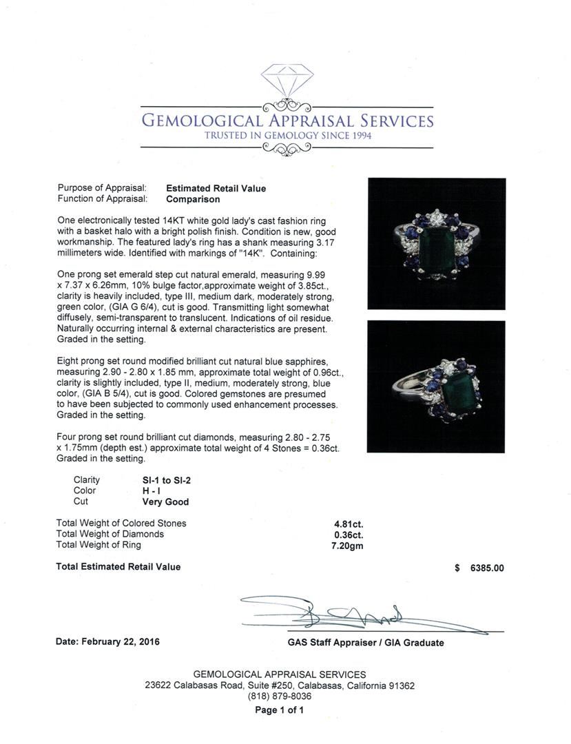 One electronically tested 14KT white gold lady's cast fashion ring with a basket halo with a bright polish finish. The featured lady's ring has a shank measuring 3.17 millimeters wide. Identified with markings of "14K". Condition is new, good workmanship. Containing: One prong set emerald step cut natural emerald, measuring 9.99 x 7.37 x 6.26mm, 10%. bulge factor, approximate weight of 3.85ct., clarity is heavily included, type III, medium dark, moderately strong, green color, (GIA G 6/4), cut is good. Transmitting light somewhat diffusely, semi-transparent to translucent. Indications of oil residue. Naturally occurring internal & external characteristics are present. Graded in the setting. Eight prong set round modified brilliant cut natural blue sapphires, measuring 2.90 - 2.80 x 1.85 mm, approximate total weight of 0.96ct., clarity is slightly included, type II, medium, moderately strong, blue color, (GIA B 5/4), cut is good. Colored gemstones are presumed to have been subjected to commonly used enhancement processes. Graded in the setting. Four prong set round brilliant cut diamonds, measuring 2.80 - 2.75 x 1.75mm (depth est.) approximate total weight of 4 Stones = 0.36ct. Graded in the setting. Clarity: SI-1 to SI-2. Color: H - I. Cut Very Good. Total Weight of Colored Stones 4.81ct. Total Weight of Diamonds 0.36ct. Total Weight of Ring 7.20gm. GAS Appraised at $6,385.00.