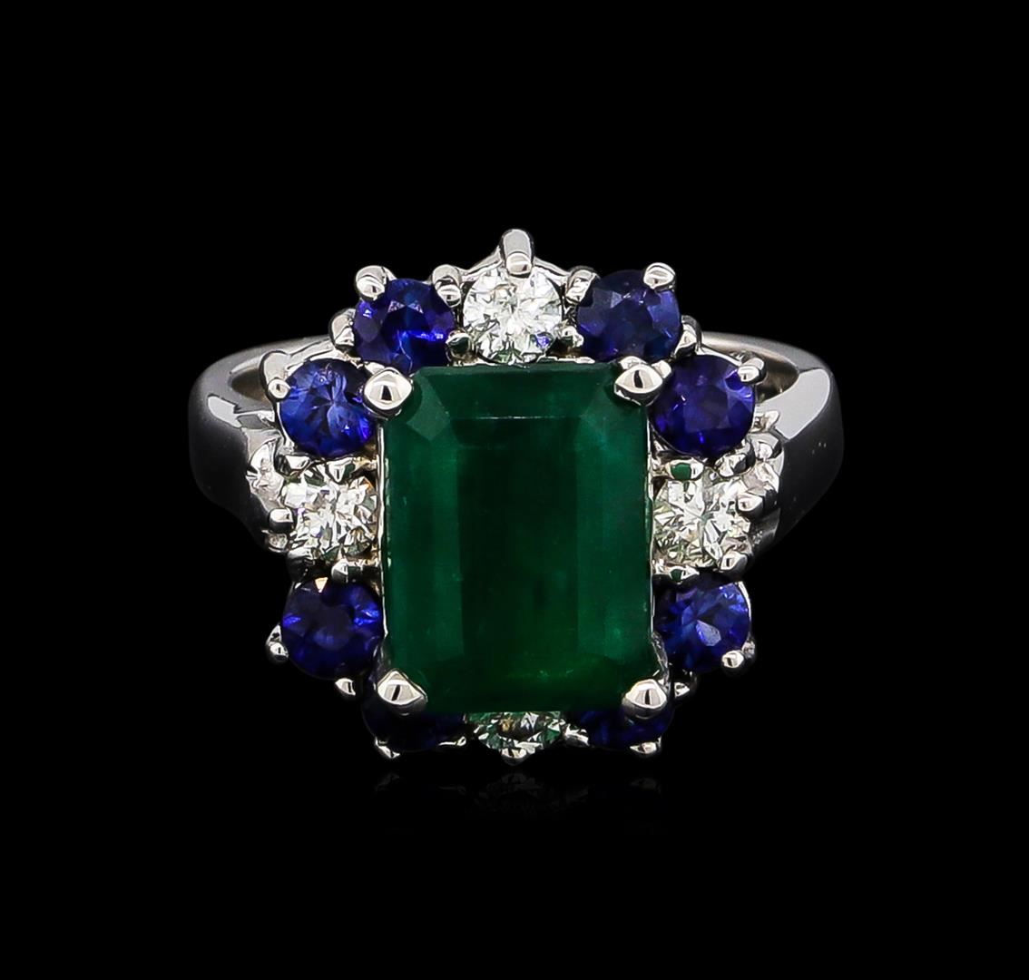 One electronically tested 14KT white gold lady's cast fashion ring with a basket halo with a bright polish finish. The featured lady's ring has a shank measuring 3.17 millimeters wide. Identified with markings of "14K". Condition is new, good workmanship. Containing: One prong set emerald step cut natural emerald, measuring 9.99 x 7.37 x 6.26mm, 10%. bulge factor, approximate weight of 3.85ct., clarity is heavily included, type III, medium dark, moderately strong, green color, (GIA G 6/4), cut is good. Transmitting light somewhat diffusely, semi-transparent to translucent. Indications of oil residue. Naturally occurring internal & external characteristics are present. Graded in the setting. Eight prong set round modified brilliant cut natural blue sapphires, measuring 2.90 - 2.80 x 1.85 mm, approximate total weight of 0.96ct., clarity is slightly included, type II, medium, moderately strong, blue color, (GIA B 5/4), cut is good. Colored gemstones are presumed to have been subjected to commonly used enhancement processes. Graded in the setting. Four prong set round brilliant cut diamonds, measuring 2.80 - 2.75 x 1.75mm (depth est.) approximate total weight of 4 Stones = 0.36ct. Graded in the setting. Clarity: SI-1 to SI-2. Color: H - I. Cut Very Good. Total Weight of Colored Stones 4.81ct. Total Weight of Diamonds 0.36ct. Total Weight of Ring 7.20gm. GAS Appraised at $6,385.00.