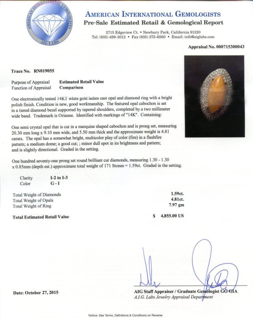One electronically tested 14KT white gold ladies cast opal and diamond ring with a bright polish finish. Condition is new, good workmanship. The featured opal cabochon is set in a tiered diamond bezel supported by tapered shoulders, completed by a two millimeter wide band. Trademark is Orianne. Identified with markings of "14K". Containing: One semi crystal opal that is cut in a marquise shaped cabochon and is prong set, measuring 20.30 mm long x 9.10 mm wide, and 5.50 mm thick and the approximate weight is 4.81 carats. The opal has a somewhat bright, multicolor play of color (fire) in a flashfire pattern a medium dome a good cut minor dull spot in its brightness and pattern and is slightly directional. Graded in the setting. One hundred seventy-one prong set round brilliant cut diamonds, measuring 1.30 - 1.30 x 0.85mm (depth est.) approximate total weight of 171 Stones = 1.59ct. Graded in the setting. Clarity I-2 to I-3 Color G - I Total Weight of Diamonds 1.59ct. Total Weight of Opals 4.81ct. Total Weight of Ring 7.97 gm