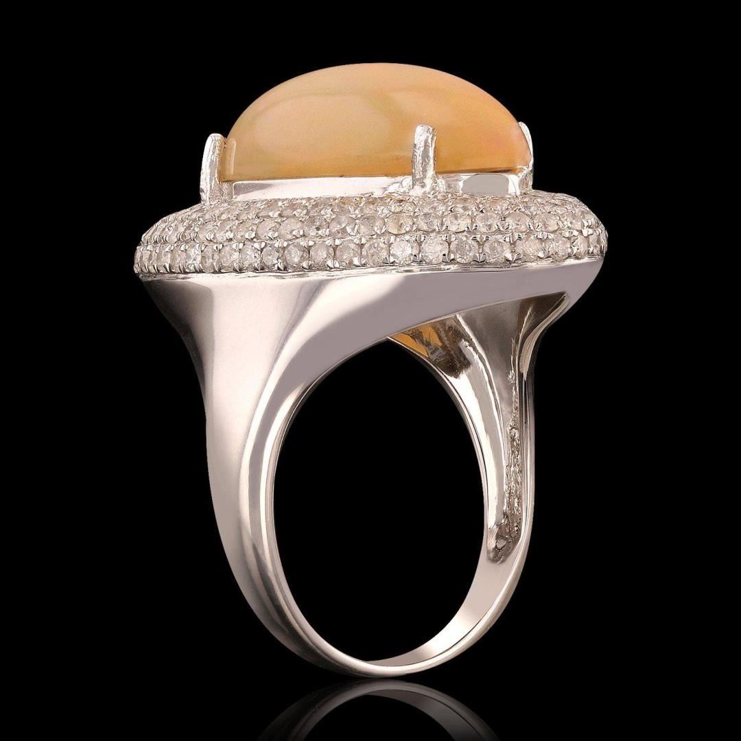 One electronically tested 14KT white gold ladies cast opal and diamond ring with a bright polish finish. Condition is new, good workmanship. The featured opal cabochon is set in a tiered diamond bezel supported by tapered shoulders, completed by a two millimeter wide band. Trademark is Orianne. Identified with markings of "14K". Containing: One semi crystal opal that is cut in a marquise shaped cabochon and is prong set, measuring 20.30 mm long x 9.10 mm wide, and 5.50 mm thick and the approximate weight is 4.81 carats. The opal has a somewhat bright, multicolor play of color (fire) in a flashfire pattern; a medium dome; a good cut; ; minor dull spot in its brightness and pattern; and is slightly directional. Graded in the setting. One hundred seventy-one prong set round brilliant cut diamonds, measuring 1.30 - 1.30 x 0.85mm (depth est.) approximate total weight of 171 Stones = 1.59ct. Graded in the setting. Clarity I-2 to I-3 Color G - I Total Weight of Diamonds 1.59ct. Total Weight of Opals 4.81ct. Total Weight of Ring 7.97 gm #Size: 7