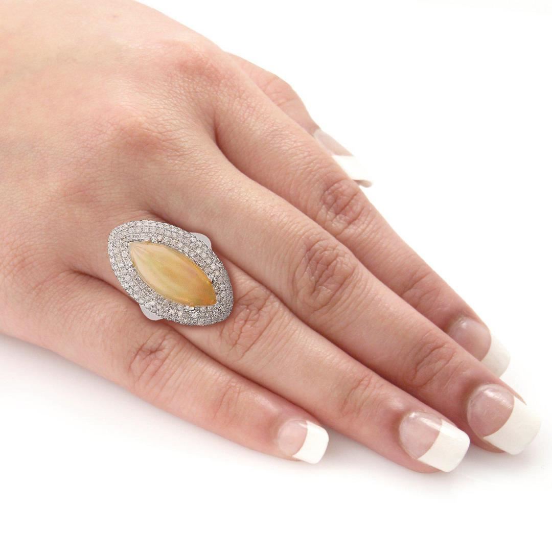 One electronically tested 14KT white gold ladies cast opal and diamond ring with a bright polish finish. Condition is new, good workmanship. The featured opal cabochon is set in a tiered diamond bezel supported by tapered shoulders, completed by a two millimeter wide band. Trademark is Orianne. Identified with markings of "14K". Containing: One semi crystal opal that is cut in a marquise shaped cabochon and is prong set, measuring 20.30 mm long x 9.10 mm wide, and 5.50 mm thick and the approximate weight is 4.81 carats. The opal has a somewhat bright, multicolor play of color (fire) in a flashfire pattern; a medium dome; a good cut; ; minor dull spot in its brightness and pattern; and is slightly directional. Graded in the setting. One hundred seventy-one prong set round brilliant cut diamonds, measuring 1.30 - 1.30 x 0.85mm (depth est.) approximate total weight of 171 Stones = 1.59ct. Graded in the setting. Clarity I-2 to I-3 Color G - I Total Weight of Diamonds 1.59ct. Total Weight of Opals 4.81ct. Total Weight of Ring 7.97 gm #Size: 7
