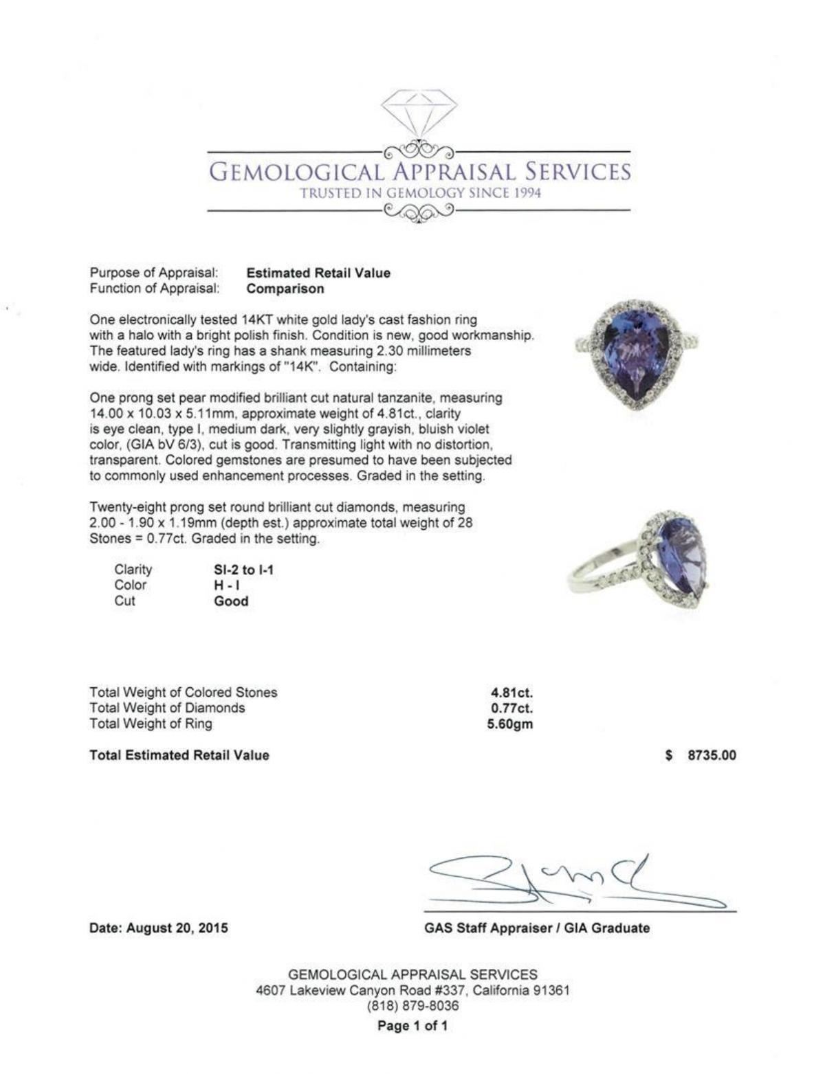 One electronically tested 14KT white gold lady's cast fashion ring with a halo with a bright polish finish. The featured lady's ring has a shank measuring 2.30 millimeters wide. Identified with markings of "14K". Condition is new, good workmanship. Containing: One prong set pear modified brilliant cut natural tanzanite, measuring 14.00 x 10.03 x 5.11mm, approximate weight of 4.81ct., clarity is eye clean, type I, medium dark, very slightly grayish, bluish violet color, (GIA bV 6/3), cut is good. Transmitting light with no distortion, transparent. Colored gemstones are presumed to have been subjected to commonly used enhancement processes. Graded in the setting. Twenty-Eight prong set round brilliant cut diamonds, measuring 2.00 - 1.90 x 1.19mm (depth est.) approximate total weight of 28 Stones = 0.77ct. Graded in the setting. Clarity: SI-2 to I-1. Color: H - I. Cut Good. Total Weight of Colored Stones 4.81ct. Total Weight of Diamonds 0.77ct. Total Weight of Ring 5.60gm. GAS Appraised.