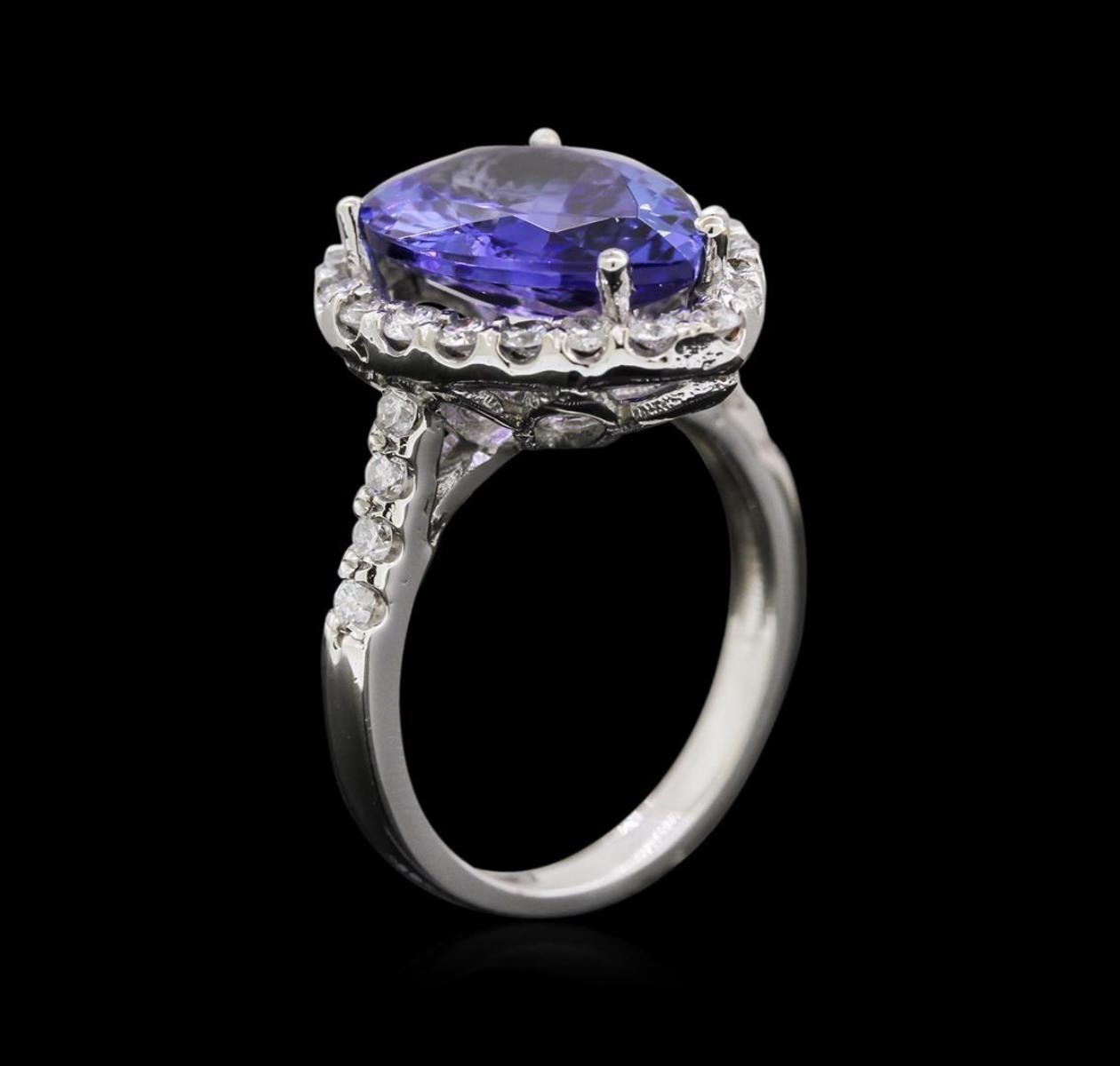 One electronically tested 14KT white gold lady's cast fashion ring with a halo with a bright polish finish. The featured lady's ring has a shank measuring 2.30 millimeters wide. Identified with markings of "14K". Condition is new, good workmanship. Containing: One prong set pear modified brilliant cut natural tanzanite, measuring 14.00 x 10.03 x 5.11mm, approximate weight of 4.81ct., clarity is eye clean, type I, medium dark, very slightly grayish, bluish violet color, (GIA bV 6/3), cut is good. Transmitting light with no distortion, transparent. Colored gemstones are presumed to have been subjected to commonly used enhancement processes. Graded in the setting. Twenty-Eight prong set round brilliant cut diamonds, measuring 2.00 - 1.90 x 1.19mm (depth est.) approximate total weight of 28 Stones = 0.77ct. Graded in the setting. Clarity: SI-2 to I-1. Color: H - I. Cut Good. Total Weight of Colored Stones 4.81ct. Total Weight of Diamonds 0.77ct. Total Weight of Ring 5.60gm. GAS Appraised.
