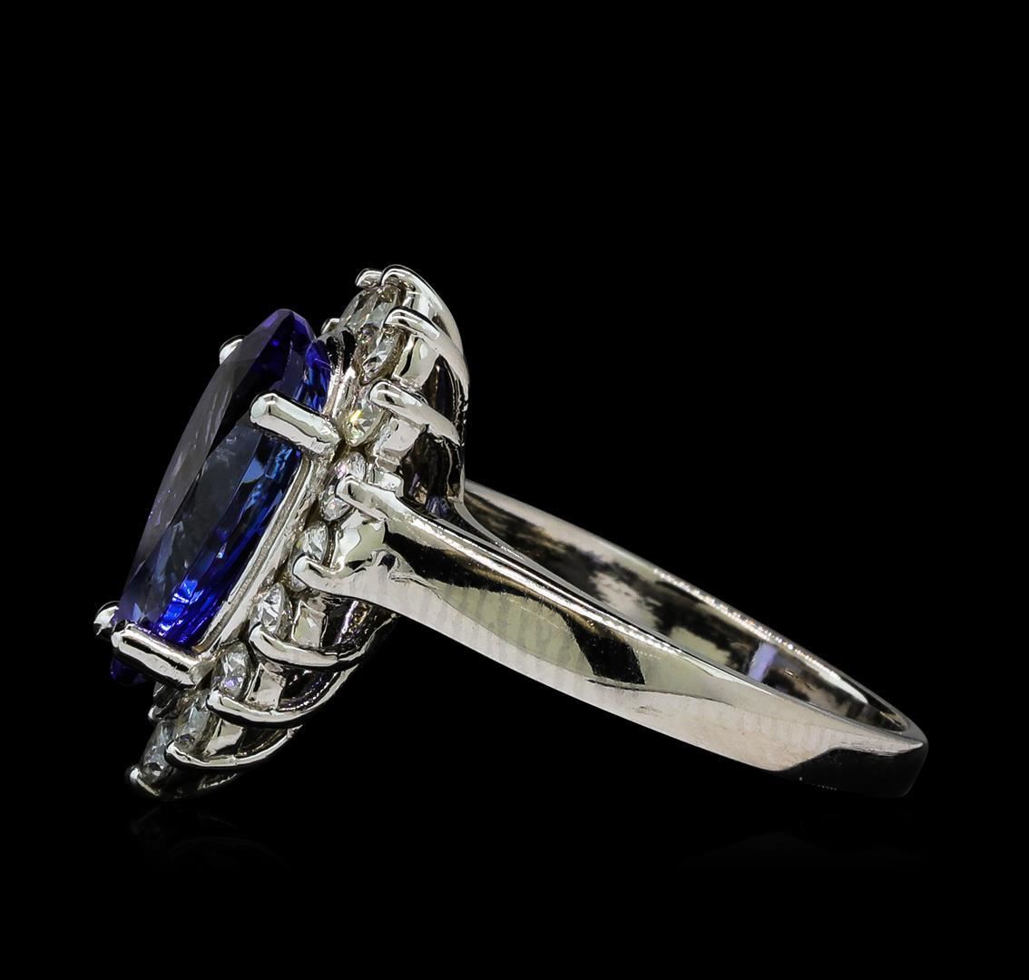 One electronically tested 14KT white gold ladies cast tanzanite and diamond ring with a bright polish finish. The featured tanzanite is set within a diamond floret supported by a ribbed under gallery and tapering shoulders, completed by a two millimeter wide band. Identified with markings of '14K'. Condition is new, good workmanship. Containing: One prong set pear mixed cut natural tanzanite, measuring 13.20 x 9.10 x 5.80mm, 3%. bulge factor, approximate weight of 4.81ct., clarity is eye clean, type I, medium, very slightly grayish, bluish violet color, (GIA bV 5/3), cut is good. Transmitting light with no distortion, transparent. Graded in the setting. Tanzanite is a very rare gemstone that is only found in the country of Tanzania. Originally discovered in 1967. Tiffany & Company, named the stone Tanzanite. It is found in the Usumburu Mountains that border the Umba Valley of northern Tanzania. Tanzanite occurs in gray, brown, violet, blue, reddish-purple, & green. The gem is interesting because of its exceptional pleochroism. Rotated in different directions a tanzanite will exhibit multiple changes of color. Tanzanite has a low tolerance to ultrasonic cleaning, and should not be cleaned using this method. Sixteen prong set round brilliant cut diamonds, measuring 2.50 - 2.50 x 1.50mm (depth est.) approximate total weight of 16 Stones = 1.00ct. The clarity grade reflects the entire range of clarity for this group. Graded in the setting. Clarity SI-1 to I-2. Color: F - H. Total Weight of Colored Stones 4.81ct.. Total Weight of Diamonds 1.00ct.. Total Weight of Ring 6.40gm. AIG Appraised.
