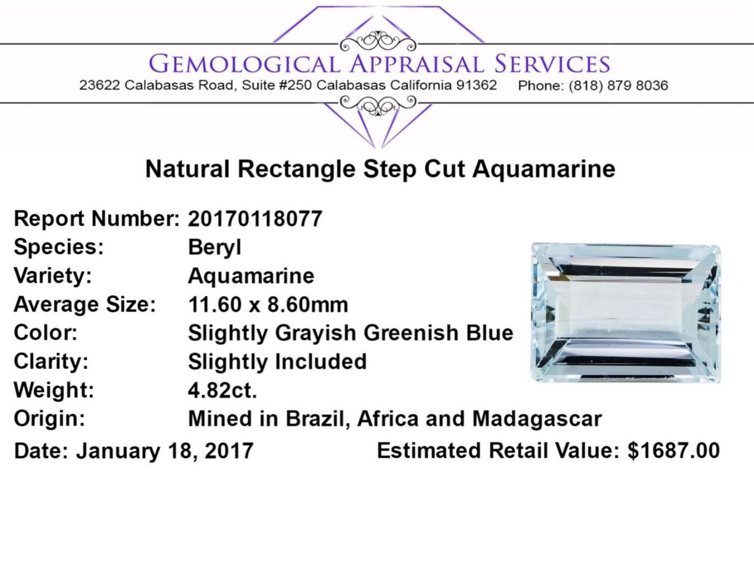 One natural rectangle step cut aquamarine with an exact weight of 4.82ct., clarity is slightly included, slightly grayish greenish blue. Gemological Appraisals Services estimates the retail value at $1687 GAS Appraised.