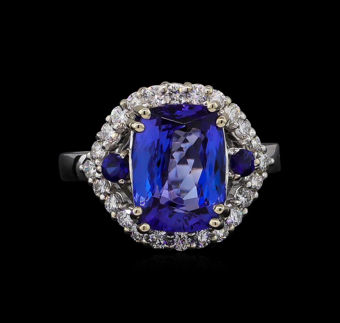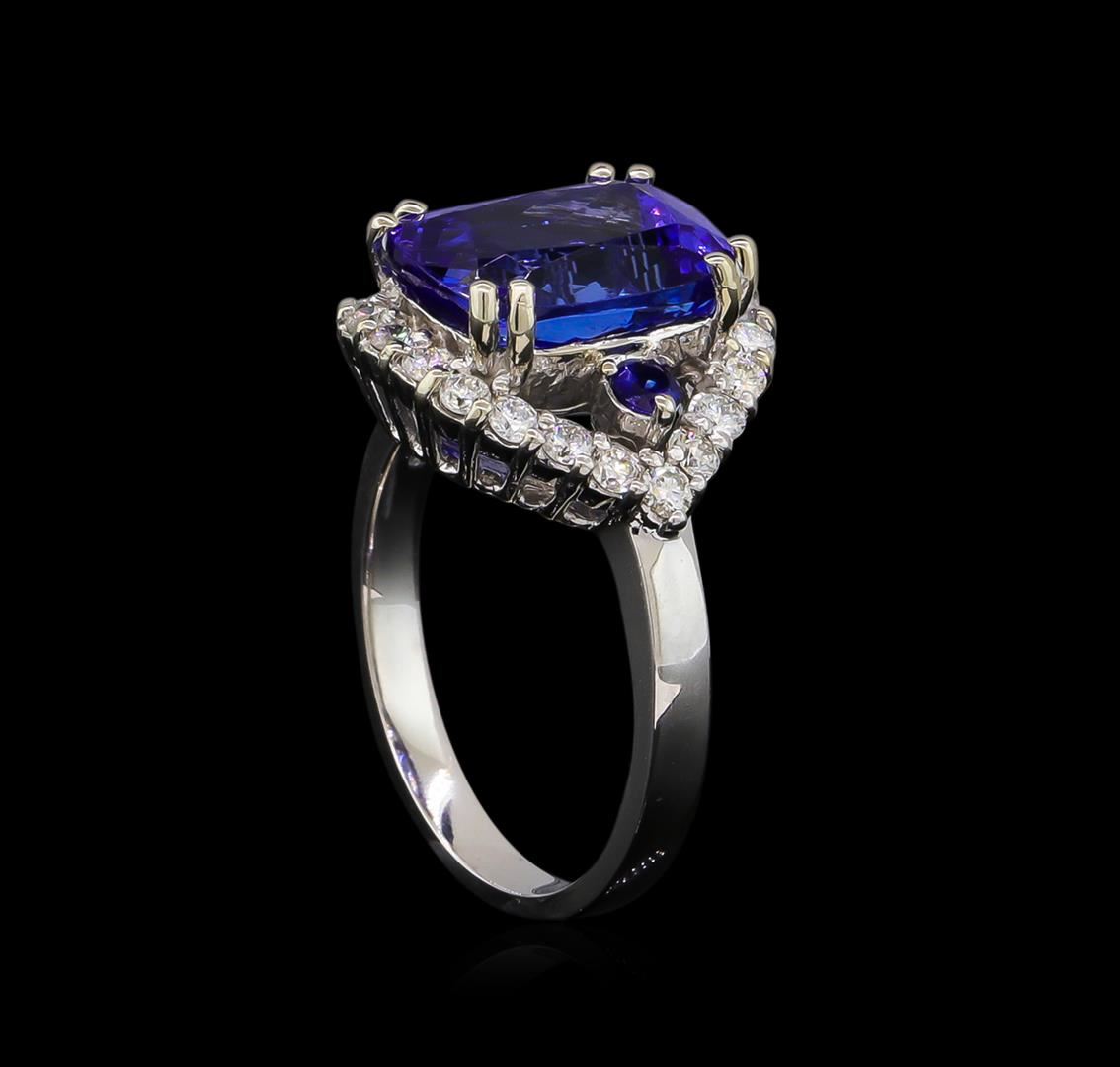 One electronically tested 14KT white gold lady's cast fashion ring with a split shank with a bright polish finish. The featured lady's ring has a shank measuring 2.40 millimeters wide. Identified with markings of "K14". Condition is new, good workmanship. Containing: One prong set rectangular cushion modified brilliant cut natural tanzanite, measuring 11.28 x 8.18 x 5.56mm, 15%. bulge factor, approximate weight of 4.65ct., clarity is eye clean, type I, medium, moderately strong, bluish violet color, (GIA bV 5/4), cut is very good. Transmitting light with no distortion, transparent. Colored gemstones are presumed to have been subjected to commonly used enhancement processes. Graded in the setting. Two prong set round modified brilliant cut natural blue sapphires, measuring 2.50 - 2.40 x 1.59 mm, approximate. Total Weight of 0.17ct., clarity is eye clean, type II, medium, moderately strong, blue color, (GIA B 5/4), cut is very good. Transmitting light with no distortion, transparent. Colored gemstones are presumed to have been subjected to commonly used enhancement processes. Graded in the setting. Twenty-Four prong set round brilliant cut diamonds, measuring 1.90 - 1.80 x 1.15mm (depth est.) approximate. Total Weight of 24 Stones = 0.57ct. Graded in the setting. Clarity: VS-2 to SI-1. Color: H - I. Cut Very Good. Total Weight of Colored Stones 4.82ct. Total Weight of Diamonds 0.57ct. Total Weight of Ring 5.70gm. GAS Appraised at $9,665.00.