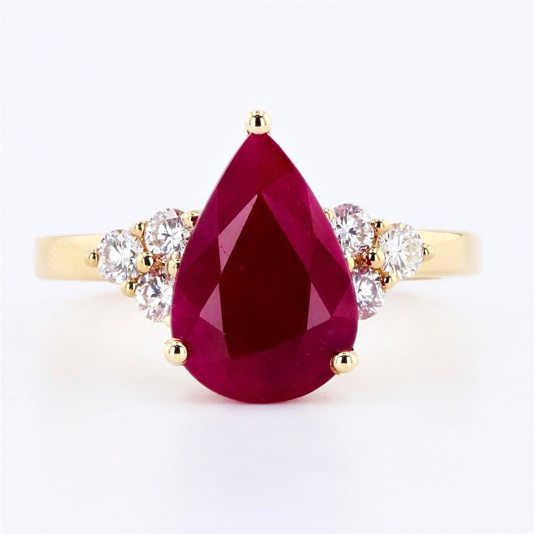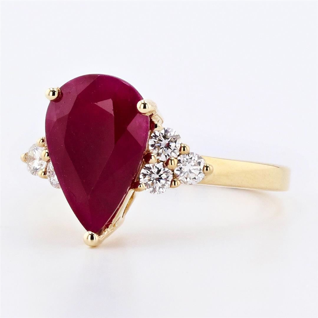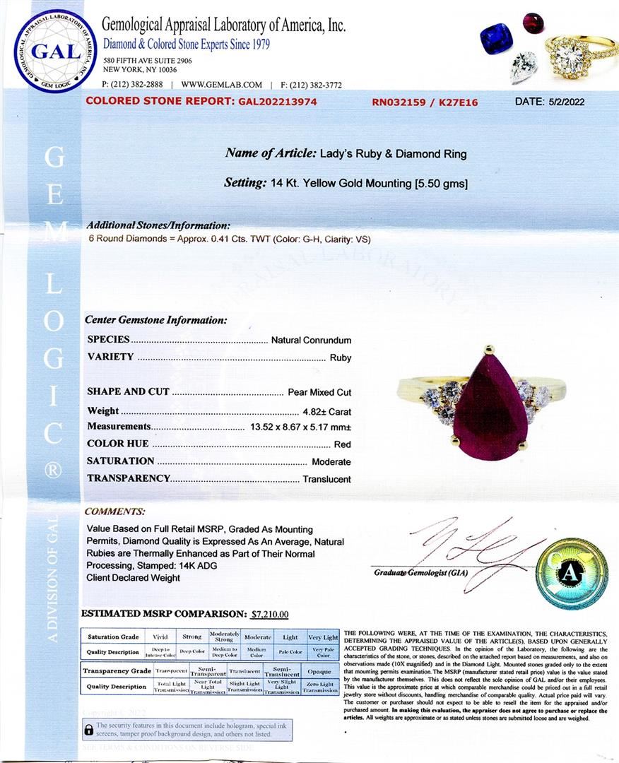 4.82ct Ruby and 0.41ctw Diamond 14K Yellow Gold Ring. Please see Photos and Description for all available information. A beauty to behold, this elegant 14K yellow gold ring features a fine-cut 4.82ct ruby and 6 round diamonds weighing 0.41ctw. A charming piece of jewelry, this ring is a perfect choice for a bride-to-be or a loved one. The ring is size 7.