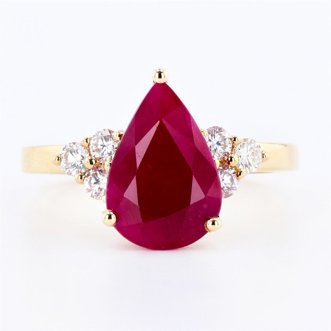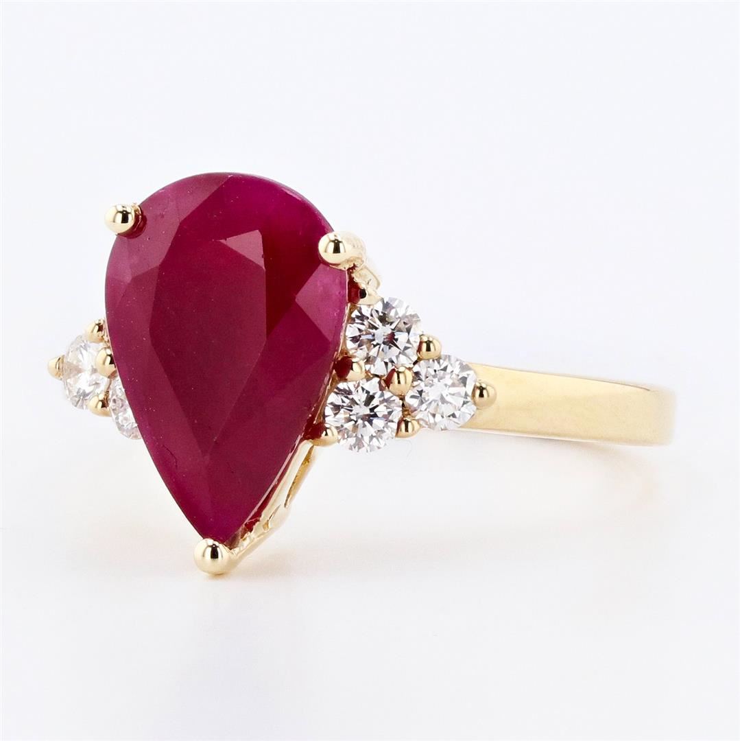 4.82ct Ruby and 0.41ctw Diamond 14K Yellow Gold Ring. Name of Article: Lady's Ruby and Diamond Ring Setting: 14 Kt. Yellow Gold Mounting [5.50 gms] Additional Stones/Information: 6 Round Diamonds = Approx. 0.41 Cts. TWT (Color: G-H, Clarity: VS) Center Gemstone Information: SPECIES: Natural Conrundum VARIETY: Ruby SHAPE AND CUT: Pear Mixed Cut Weight: 4.82 Carat Measurements: 13.52 x 8.67 x 5.17mm COLOR HUE: Red SATURATION: Moderate TRANSPARENCY: Translucent