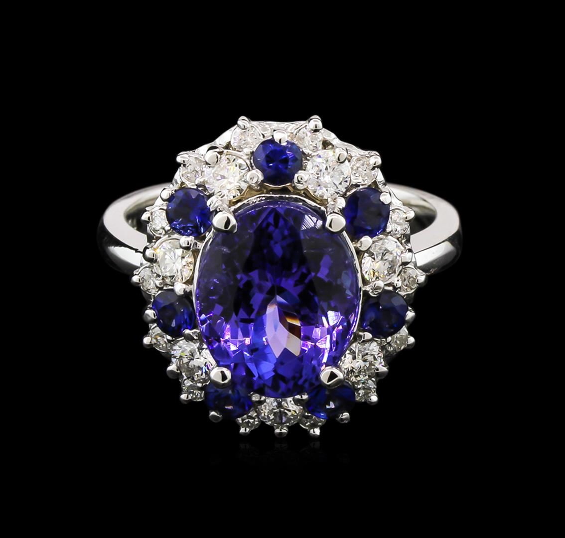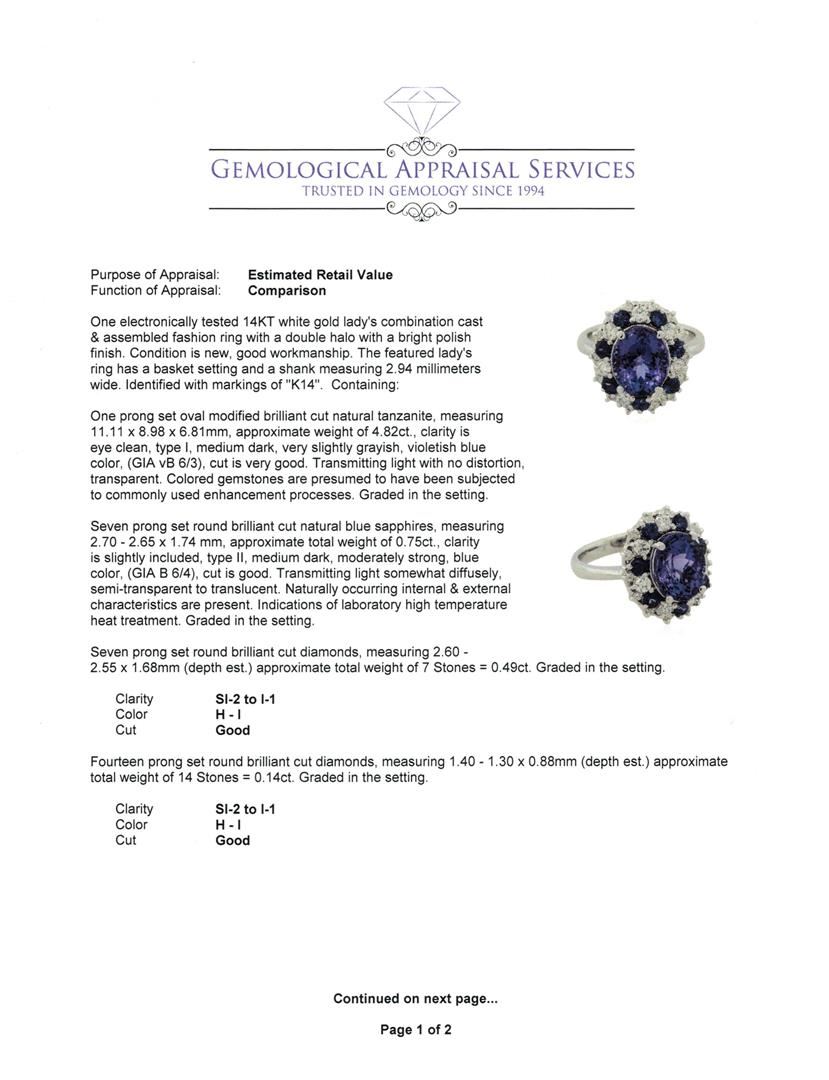 One electronically tested 14KT white gold lady's combination cast & assembled fashion ring with a double halo with a bright polish finish. The featured lady's ring has a basket setting and a shank measuring 2.94 millimeters wide. Identified with markings of "K14". Condition is new, good workmanship. Containing: One prong set oval modified brilliant cut natural tanzanite, measuring 11.11 x 8.98 x 6.81mm, approximate weight of 4.82ct., clarity is eye clean, type I, medium dark, very slightly grayish, violetish blue color, (GIA vB 6/3), cut is very good. Transmitting light with no distortion, transparent. Colored gemstones are presumed to have been subjected to commonly used enhancement processes. Graded in the setting. Seven prong set round brilliant cut natural blue sapphires, measuring 2.70 - 2.65 x 1.74 mm, approximate total weight of 0.75ct., clarity is slightly included, type II, medium dark, moderately strong, blue color, (GIA B 6/4), cut is good. Transmitting light somewhat diffusely, semi-transparent to translucent. Naturally occurring internal & external characteristics are present. Indications of laboratory high temperature heat treatment. Graded in the setting. Seven prong set round brilliant cut diamonds, measuring 2.60 - 2.55 x 1.68mm (depth est.) approximate total weight of 7 Stones = 0.49ct. Graded in the setting. Clarity: SI-2 to I-1. Color: H - I. Cut Good Fourteen prong set round brilliant cut diamonds, measuring 1.40 - 1.30 x 0.88mm (depth est.) approximate total weight of 14 Stones = 0.14ct. Graded in the setting. Clarity: SI-2 to I-1. Color: H - I. Cut Good. Total Weight of Colored Stones 5.57ct. Total Weight of Diamonds 0.63ct. Total Weight of Ring 5.20gm. GAS Appraised at $9,345.00.