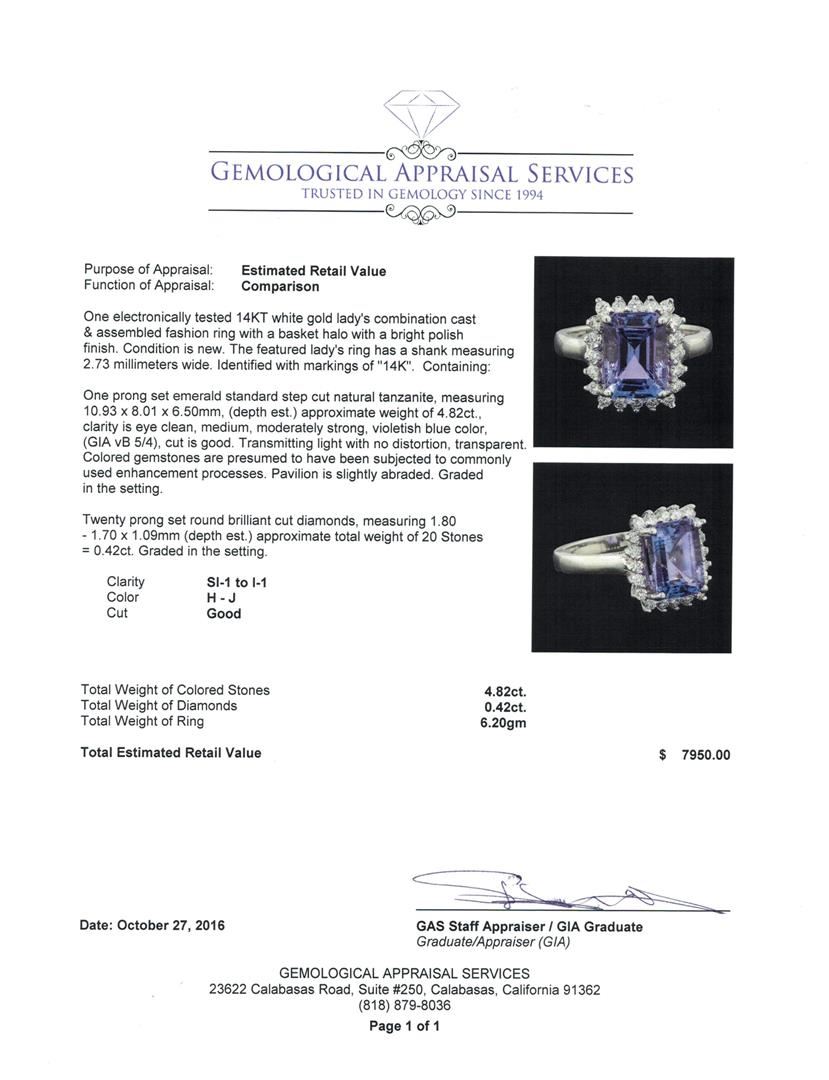 One electronically tested 14KT white gold lady's combination cast & assembled fashion ring with a basket halo with a bright polish finish. The featured lady's ring has a shank measuring 2.73 millimeters wide. Identified with markings of '14K'. Condition is new. Containing: One prong set emerald standard step cut natural tanzanite, measuring 10.93 x 8.01 x 6.50mm, (depth est.) approximate weight of 4.82ct., clarity is eye clean, medium, moderately strong, violetish blue color, (GIA vB 5/4), cut is good. Transmitting light with no distortion, transparent. Colored gemstones are presumed to have been subjected to commonly used enhancement processes. Pavilion is slightly abraded. Graded in the setting. Twenty prong set round brilliant cut diamonds, measuring 1.80 - 1.70 x 1.09mm (depth est.) approximate total weight of 20 Stones = 0.42ct. Graded in the setting. Clarity SI-1 to I-1. Color: H - J Cut Good. Total Weight of Colored Stones 4.82ct.. Total Weight of Diamonds 0.42ct.. Total Weight of Ring 6.20gm. GAS Appraised at $7,950.00.