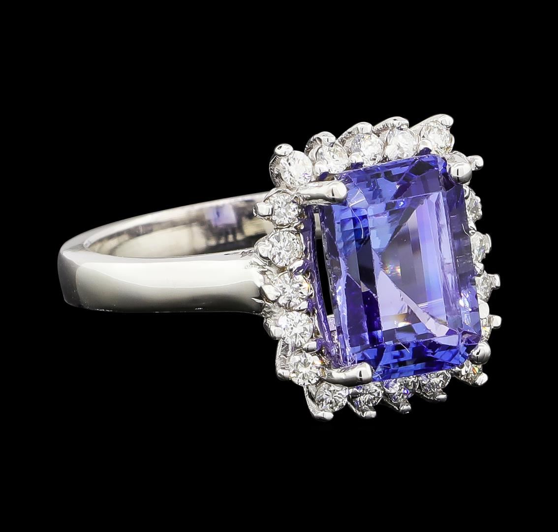 One electronically tested 14KT white gold lady's combination cast & assembled fashion ring with a basket halo with a bright polish finish. The featured lady's ring has a shank measuring 2.73 millimeters wide. Identified with markings of '14K'. Condition is new. Containing: One prong set emerald standard step cut natural tanzanite, measuring 10.93 x 8.01 x 6.50mm, (depth est.) approximate weight of 4.82ct., clarity is eye clean, medium, moderately strong, violetish blue color, (GIA vB 5/4), cut is good. Transmitting light with no distortion, transparent. Colored gemstones are presumed to have been subjected to commonly used enhancement processes. Pavilion is slightly abraded. Graded in the setting. Twenty prong set round brilliant cut diamonds, measuring 1.80 - 1.70 x 1.09mm (depth est.) approximate total weight of 20 Stones = 0.42ct. Graded in the setting. Clarity SI-1 to I-1. Color: H - J Cut Good. Total Weight of Colored Stones 4.82ct.. Total Weight of Diamonds 0.42ct.. Total Weight of Ring 6.20gm. GAS Appraised at $7,950.00.
