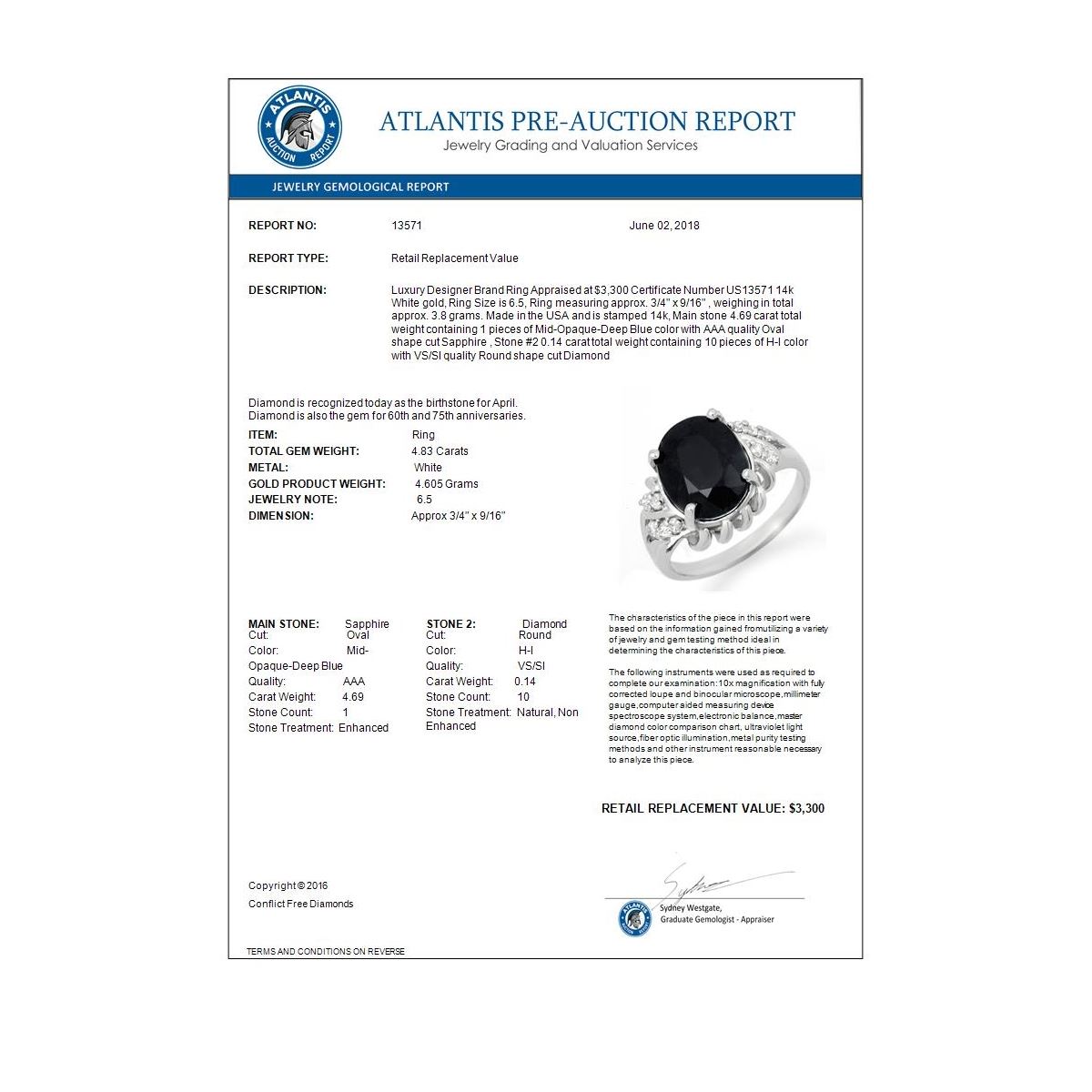 REF-54A2X -13571 ---- 4.83 CTW Blue Sapphire & Diamond Ring 14K White Gold ---- Luxury Designer Brand Ring Appraised at $3,300 Certificate Number US13571 14k White gold, Ring Size is 6.5, Ring measuring approx. 3/4" x 9/16" , weighing in total approx. 3.8 grams. Made in the USA and is stamped 14k, Main stone 4.69 carat total weight containing 1 pieces of Mid-Opaque-Deep Blue color with AAA quality Oval shape cut Sapphire , Stone #2 0.14 carat total weight containing 10 pieces of H-I color with VS/SI quality Round shape cut Diamond