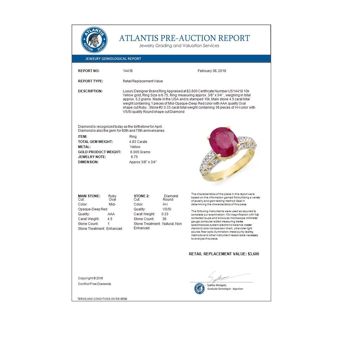 REF-50N5Y -14418 ---- 4.83 CTW Ruby & Diamond Ring 10K Yellow Gold ---- Luxury Designer Brand Ring Appraised at $3,600 Certificate Number US14418 10k Yellow gold, Ring Size is 6.75, Ring measuring approx. 3/8" x 3/4" , weighing in total approx. 5.2 grams. Made in the USA and is stamped 10k, Main stone 4.5 carat total weight containing 1 pieces of Mid-Opaque-Deep Red color with AAA quality Oval shape cut Ruby , Stone #2 0.33 carat total weight containing 36 pieces of H-I color with VS/SI quality Round shape cut Diamond