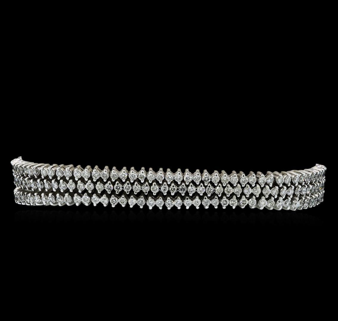 One electronically tested 14KT white gold ladies cast & assembled diamond bracelet. Seven inch length bracelet features a series of three flexible diamond ribbons, terminating in a concealed clasp with safety. Bright polish finish. Identified with markings of '14K'. Condition is good. Containing: Two Hundred Sixty-Four prong set round brilliant cut diamonds, measuring 1.70 - 1.70 x 1.02mm (depth est.) approximate total weight of 264 Stones = 4.83ct. Graded in the setting. Clarity SI-2 to I-2. Color: F - H. Total Weight of Diamonds 4.83ct.. Total Weight of Bracelet 27.12gm. AIG Appraised at $17,985.00.