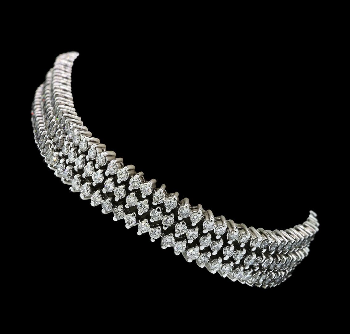 One electronically tested 14KT white gold ladies cast & assembled diamond bracelet. Seven inch length bracelet features a series of three flexible diamond ribbons, terminating in a concealed clasp with safety. Bright polish finish. Identified with markings of '14K'. Condition is good. Containing: Two Hundred Sixty-Four prong set round brilliant cut diamonds, measuring 1.70 - 1.70 x 1.02mm (depth est.) approximate total weight of 264 Stones = 4.83ct. Graded in the setting. Clarity SI-2 to I-2. Color: F - H. Total Weight of Diamonds 4.83ct.. Total Weight of Bracelet 27.12gm. AIG Appraised at $17,985.00.