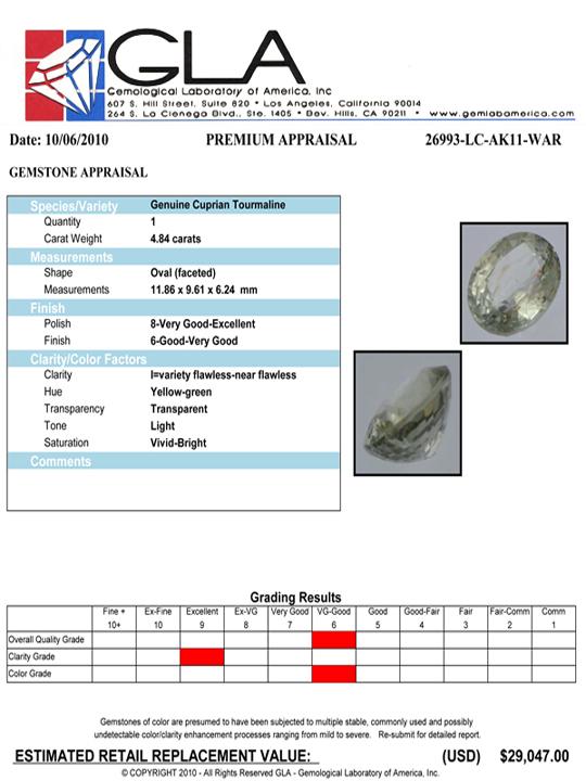 Excellent yellow green color RARE copper-bearing specimen oval cut: COPPER in tourmaline is rare and highly prized, it makes the stone color much more vivid (sometimes neon-like) and causes the stone to mimick the reflectivity of diamond; lab quality eval